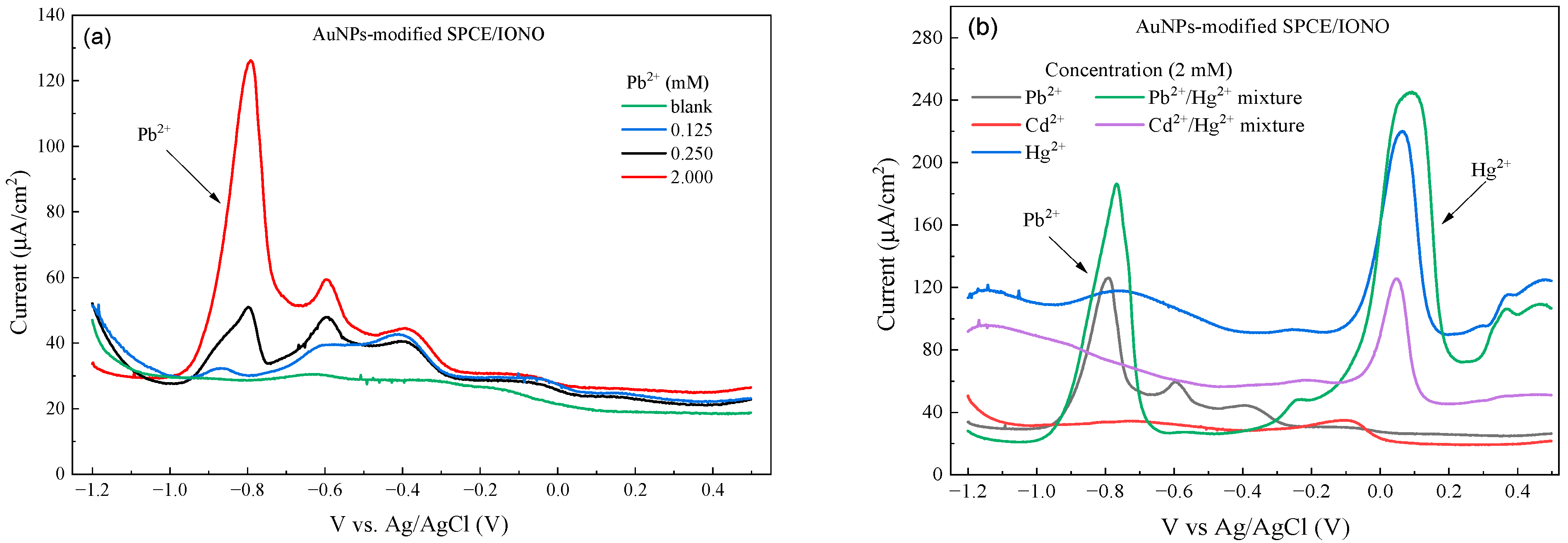 - Pan, D.; Wang, Y.; Chen, Z.; Lou, T.; Qin, W. Nanomaterial/Ionophore-Based Electrode for Anodic Stripping Voltammetric Determination of Lead: An Electrochemical Sensing Platform toward Heavy Metals. Anal. Chem. 2009, 81, 5088–5094. [Google Scholar] [CrossRef]