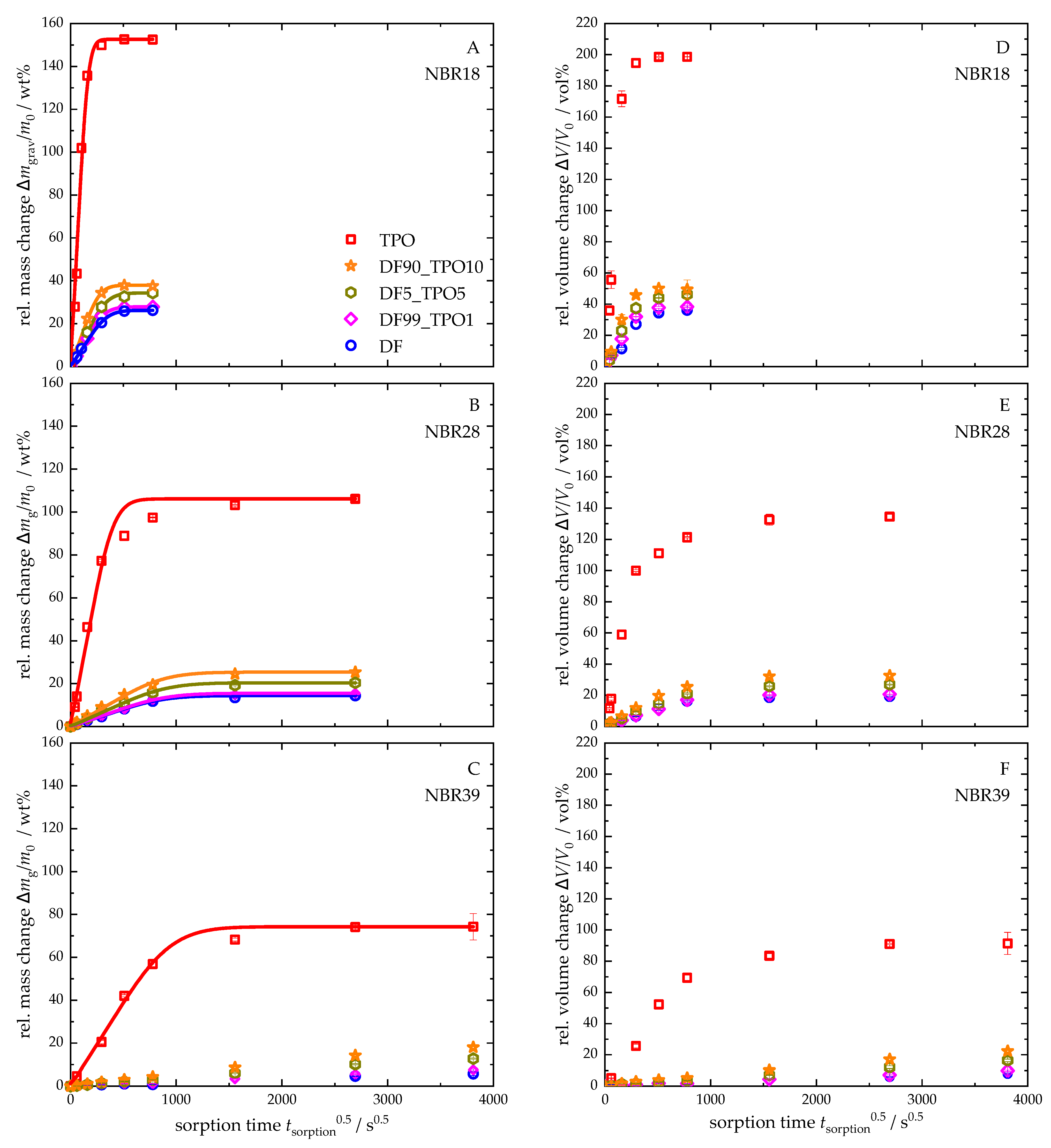 Figure 4 presents the relative mass and volume changes in NBR18 (Figure 4A,D), NBR28 (Figure 4B,E), and NBR39 (Figure 4C,F), along with the corresponding sorption curves based on Equation (4), following storage in DF, TPO, and various DF-TPO blends. The mass changes are plotted as a function of the square root of time. The equilibrium mass uptake and the diffusion coefficients derived from these experiments are summarized in Table 6. For NBR39, equilibrium was not reached in DF or the DF-TPO blends within the experimental timeframe. As a result, no sorption curves and diffusion coefficient according to Equation (4) were calculated for these. All calculated sorption curves show an initial linear increase, fulfilling the requirement for applying Fick’s second diffusion law. The equilibrium mass uptake is lowest for DF across all elastomers, with values of 26 wt% for NBR18, 14 wt% for NBR28, and 6 wt% for NBR39. In contrast, TPO exposure results in the highest mass uptakes: 153 wt% (NBR18), 106 wt% (NBR28), and 74 wt% (NBR39), respectively. Identical trends can be observed for the relative volume changes in the NBR samples compared to the relative mass changes. With a volume increase of 199 vol% due to TPO, NBR18 exhibits an almost threefold expansion of the sample. NBR28 and NBR39 also exhibit a significant increase in volume with 134 vol% and 91 vol%, respectively, which underlines the pronounced influence of TPO on material behaviour.
