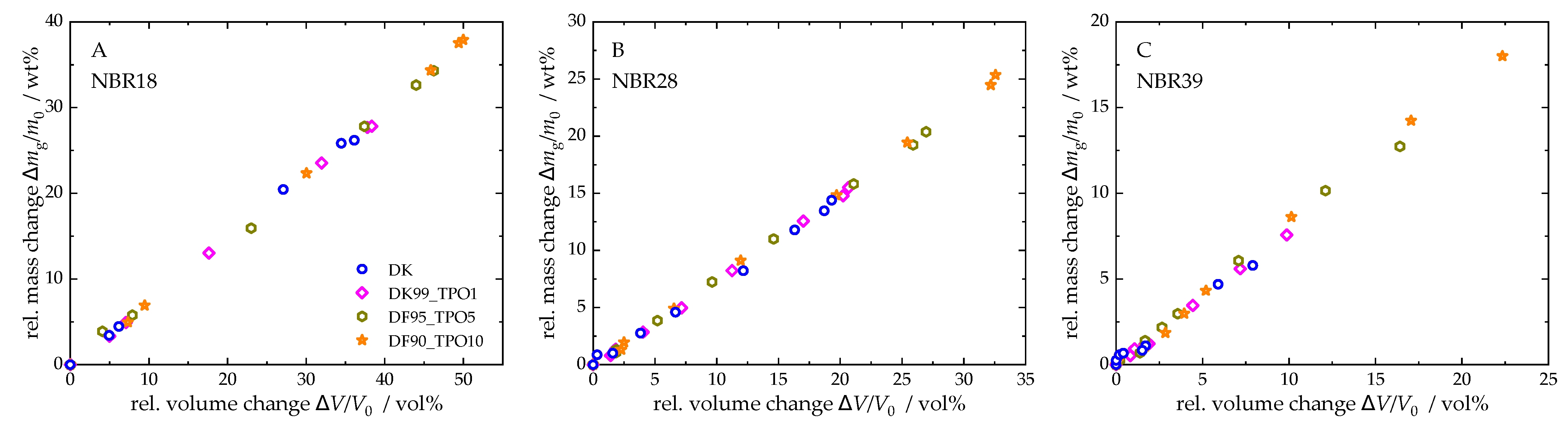 To investigate the relationship between mass and volume of the NBR sample stored in TPO-DF blends, the relative mass change was plotted as a function of the relative volume change (see Figure 5). The data for pure TPO were excluded from the analysis, as their values are significantly higher than those of the blends, which would obscure a clear representation of the results. For NBR18, the blends exhibit a linear correlation between mass and volume changes. In contrast, NBR28 (for DF) and NBR39 (for DF and the blends) show a delayed volume expansion at the beginning of sorption, which is evident from the stage observed in the mass–volume relationship. With increasing TPO content, this delayed expansion diminishes. This behaviour can be attributed to the initially small mass uptake, during which the free volume of the NBR is filled before the material begins to swell. The addition of TPO leads to a more pronounced mass increase, thereby reducing this effect.