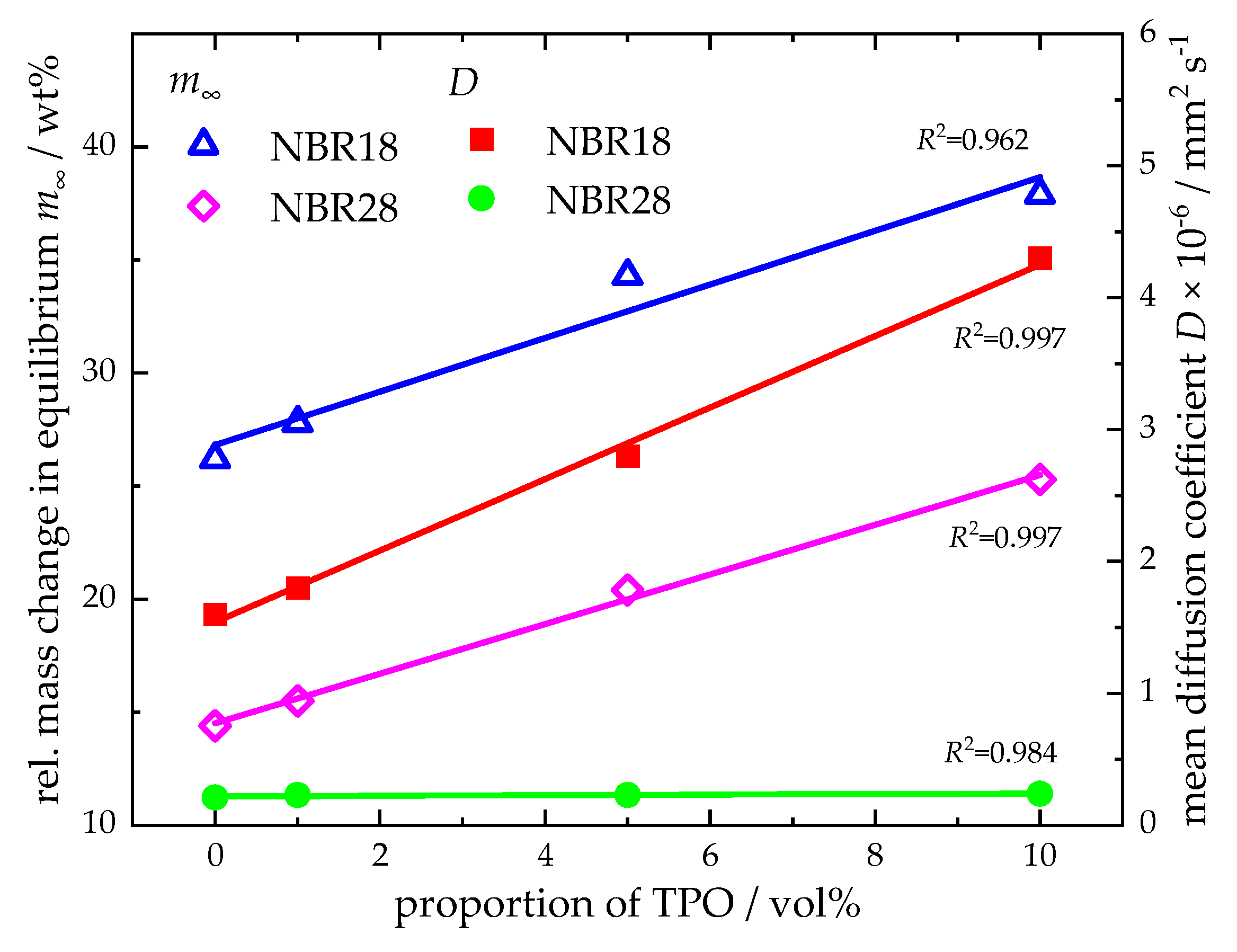 The diffusion coefficients follow the same trend as the equilibrium mass uptakes. For DF, the values are 1.6 × 10−6 mm2 s−1 (NBR18) and 0.21 × 10−6 mm2 s−1 (NBR28). For TPO results the diffusion coefficients of 11.8 × 10−6 mm2 s−1 (NBR18), 1.2 × 10−6 mm2 s−1 (NBR28), and 0.21 × 10−6 mm2 s−1 (NBR39). For the DF-TPO blends, the equilibrium mass uptake and the diffusion coefficients for the elastomers increase with rising TPO content. This relationship is clearly visible when plotting the equilibrium mass uptake and the mean diffusion coefficients against the TPO volume fraction in DF, as shown in Figure 6, where a linear correlation is observed.