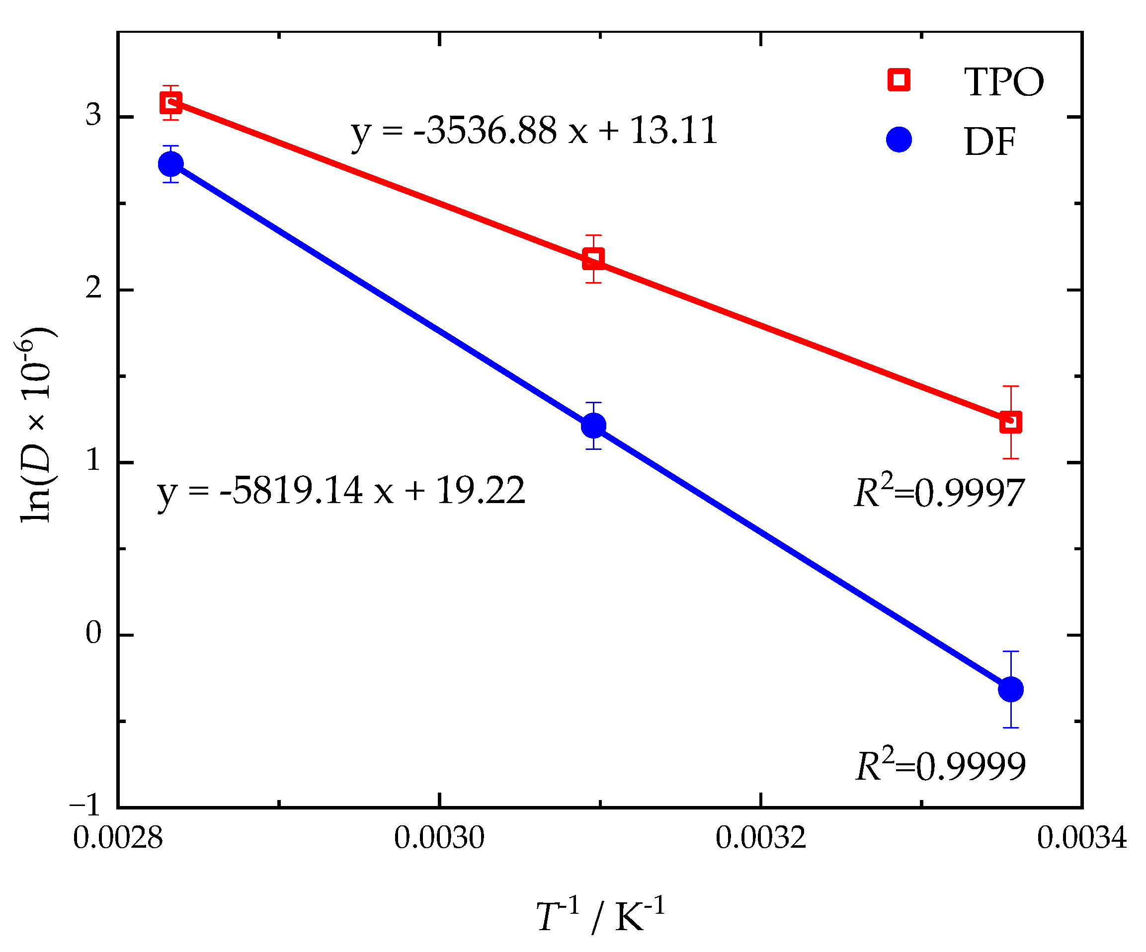 4.3.2. Temperature Dependence of the Diffusion Process of DF and TPO