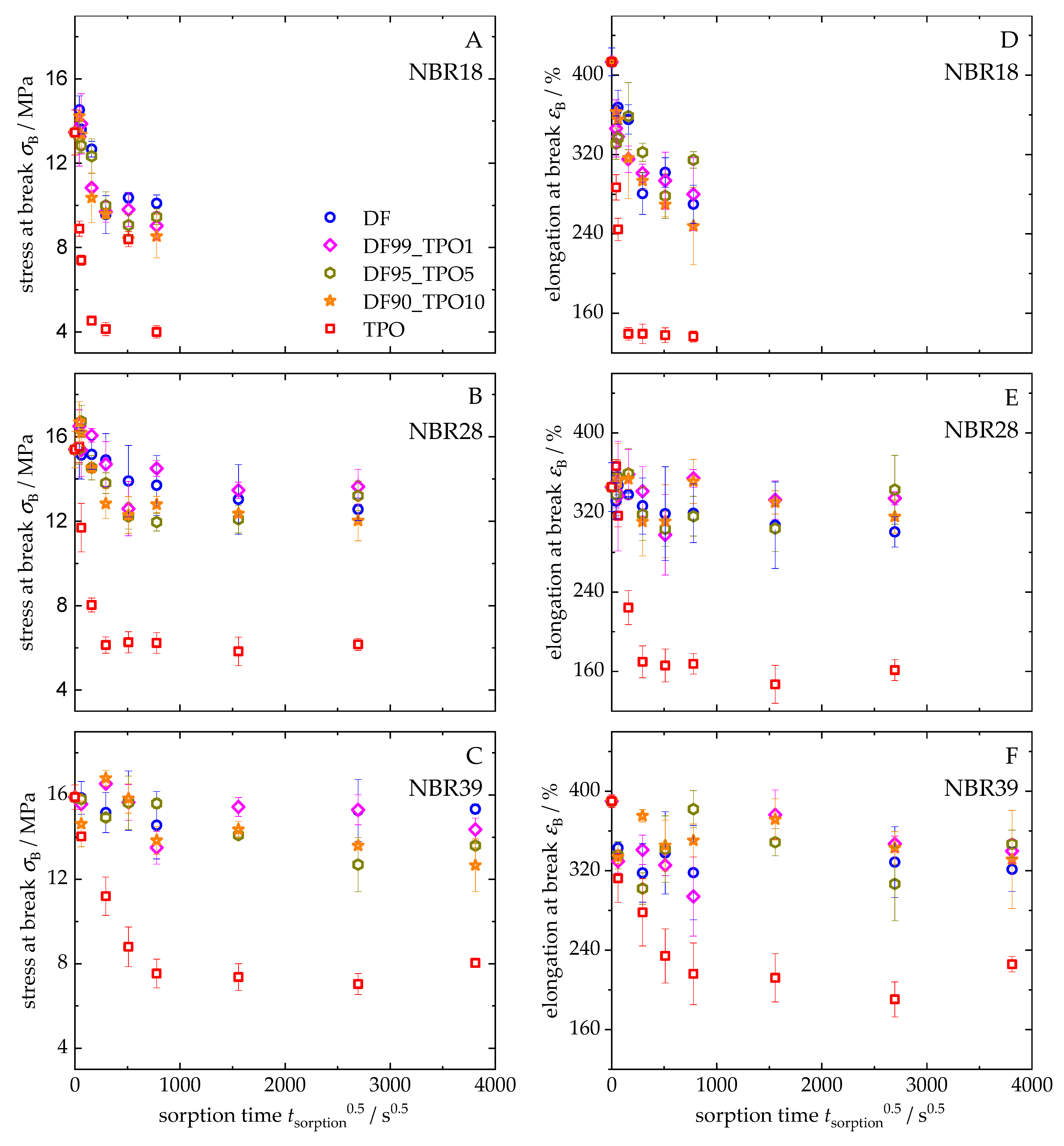 Figure 11. Stress (AC) and elongation at break (DF) over sorption time of NBR18 (A,D), NBR28 (B,E), and NBR39 (C,F) after storage in DF, TPO, and DF-TPO blends.