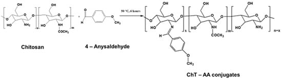 The synthesis of ChT-AA was performed according to the method reported in [] with some changes. Chitosan (1 g) was dissolved in 50 mL of 2% lactic acid solution and stirred at room temperature for 6 h. Subsequently, ethanol solutions of 4-anisaldehyde were prepared at different molar ratios relative to chitosan (1.6:1, 1:3, and 1:1), as summarised in Table 1. The corresponding volume of AA solution was added dropwise (10 mL) to the chitosan solutions. The mixtures were stirred for an additional 6 h at 50 °C.