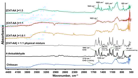 FTIR spectra of chitosan, 4-anisaldehyde, and ChT–AA conjugates at various molar ratios.