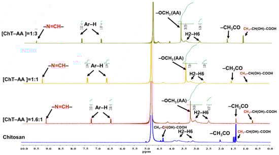 1H NMR spectra of pure chitosan and its Schiff base derivatives with 4-anisaldehyde (ChT-AA) at different molar ratios. The green lines represent the integration curves of the characteristic proton signals.