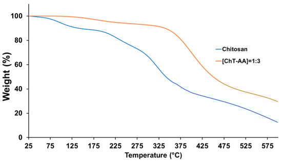 Further characterisation of chitosan and its conjugate with 4-anisaldehyde ([ChT-AA] = 1:3) was conducted using thermal gravimetric analysis (Figure 4). The first stage, observed below approximately 120 °C, involves a minor weight loss of about 10%, corresponding to the evaporation of physically adsorbed and bound water. In contrast, the [ChT-AA] = 1:3 sample exhibits a substantially lower weight loss (~0.5%) in this region, likely due to the decreased hydrophilicity of the modified polymer arising from the incorporation of hydrophobic aromatic fragments. The main decomposition of the polysaccharide backbone occurs in the range of 200–350 °C for chitosan, with a residual weight of ~66% at 300 °C (weight loss ~34%). This is in agreement with the previous studies of chitosan []. For [ChT-AA] = 1:3, the initial weight loss in the range of 200–320 °C is lower (~20–25%), and the main chain decomposition shifts to a higher temperature interval (320–450 °C), indicating improved thermal stability of the modified sample. At 500 °C, the residual weight of chitosan is ~26.7%, whereas [ChT-AA] = 1:3 retains ~40.3%.