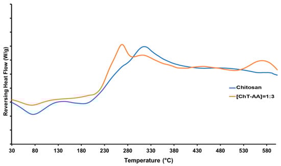 DSC was employed to investigate the thermal transitions of pure chitosan and its conjugate with anisaldehyde ([ChT-AA] = 1:3) (Figure 5). For pure chitosan, a glass transition temperature (Tg) was detected at approximately 117 °C, which is in agreement with literature data for this polysaccharide []. In contrast, the ChT-AA conjugate exhibited a slightly higher Tg of 122.5 °C, indicating restricted segmental mobility of the macromolecular chains as a result of Schiff base formation. The increase in Tg can be attributed to the presence of rigid imine bonds (C=N) and bulky anisaldehyde aromatic fragments introduced into the polymer backbone, which enhance intermolecular interactions and reduce chain flexibility.