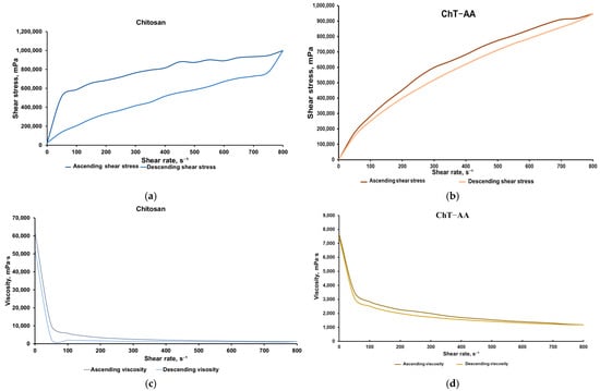 Results of the rheological analysis of gels containing chitosan and ChT-AA: Flow curves of chitosan (a) and ChT-AA containing gels (b); Viscosity curves of chitosan (c) and ChT-AA containing gels (d).