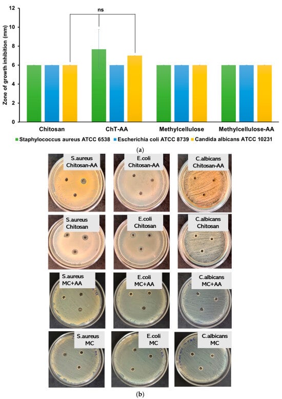 As shown in Figure 7, both the chitosan/MC and ChT–AA(1:3)/MC gels exhibited limited inhibition zones with no statistically significant differences (p > 0.05) compared to unmodified chitosan. These results suggest that under the tested conditions, the release and diffusion of 4-anisaldehyde—either free or conjugated—were insufficient to produce a pronounced antimicrobial response, though a minor trend toward improved inhibition with the presence of 4-anisaldehyde was observed. This may be attributed to the restricted diffusivity of the active component from the polymeric matrix within the agar, limiting its availability at the microbial interface.
