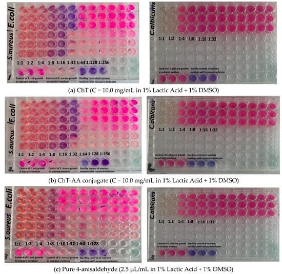The antimicrobial activity was evaluated using a two-fold serial broth microdilution method according to CLSI guidelines [,,]. Tests were performed in sterile 96-well plates with Müller-Hinton broth or Sabouraud for Candida albicans. Serial dilutions of ChT (10 mg/mL), ChT + AA (10 mg/mL), 4-anisaldehyde (2.5 μL/mL), and solvent control (1% lactic acid + 1% DMSO) were prepared in triplicate. Bacterial suspensions adjusted to 0.5 McFarland (~1.5 × 108 CFU/mL) were diluted to ~1.5 × 106 CFU/mL, and 10 μL of inoculum was added to each well. Plates were incubated at 37 °C for 24 h, then treated with 0.05 mL of 0.05% resazurin and incubated for 30 min. The minimum inhibitory concentration (MIC) was recorded as the lowest sample concentration preventing colour change (blue → pink), indicating inhibition of microbial growth.