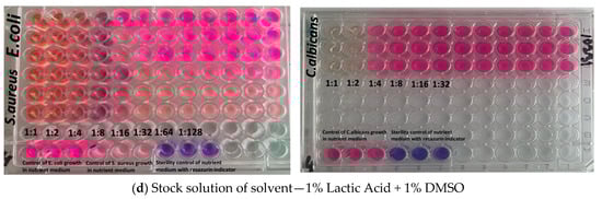 Images illustrating the evaluation of antimicrobial activity of the tested formulations using the serial dilution assay: (a) ChT (10.0 mg/mL, 1% lactic acid + 1% DMSO); (b) ChT-AA conjugate (10.0 mg/mL, 1% lactic acid + 1% DMSO); (c) pure 4-anisaldehyde (2.5 μL/mL, 1% lactic acid + 1% DMSO); and (d) solvent control (1% lactic acid + 1% DMSO).