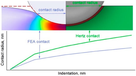 Figure 4 presents a direct comparison between the finite element simulations and the experimental AFM indentation curves obtained for the SPHERE20 and SPHERE2000 probes. The numerical and experimental curves overlap across nearly the entire indentation range, indicating that the model accurately shows small-radius contact. The maximum difference in load at the comparable indentation depths does not exceed approximately 5%, which lies within the experimental uncertainty. The good agreement between the simulated and experimental curves confirmed that the finite element configuration accurately represents the contact mechanics of the system and provides a reliable basis for determining the contact radius.