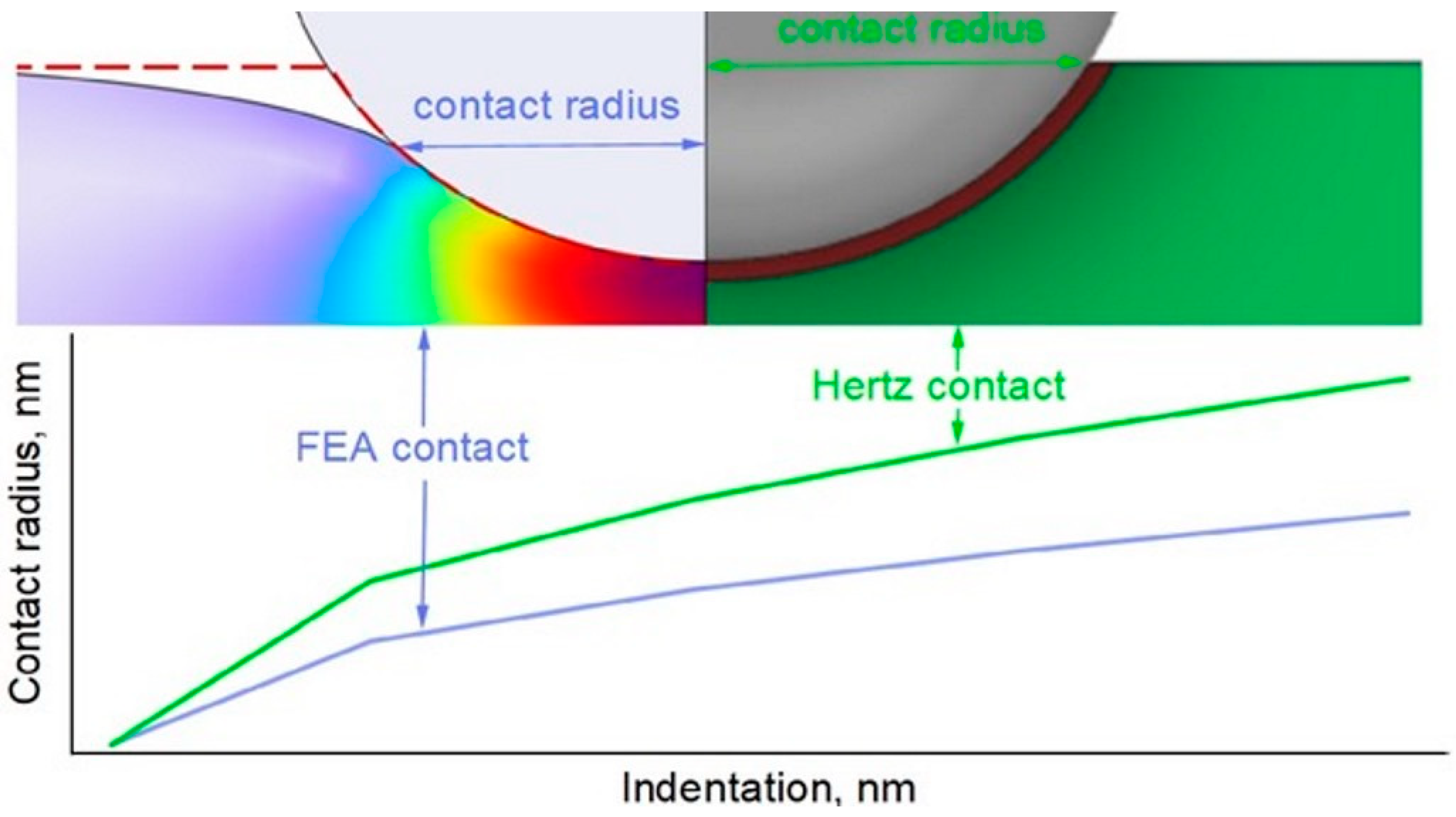 The FEA further revealed that the deformation field under the tip is not confined to the theoretical contact patch predicted by Hertzian theory. This explains why the contact area calculated from indentation depth alone is larger than the actual contact zone.