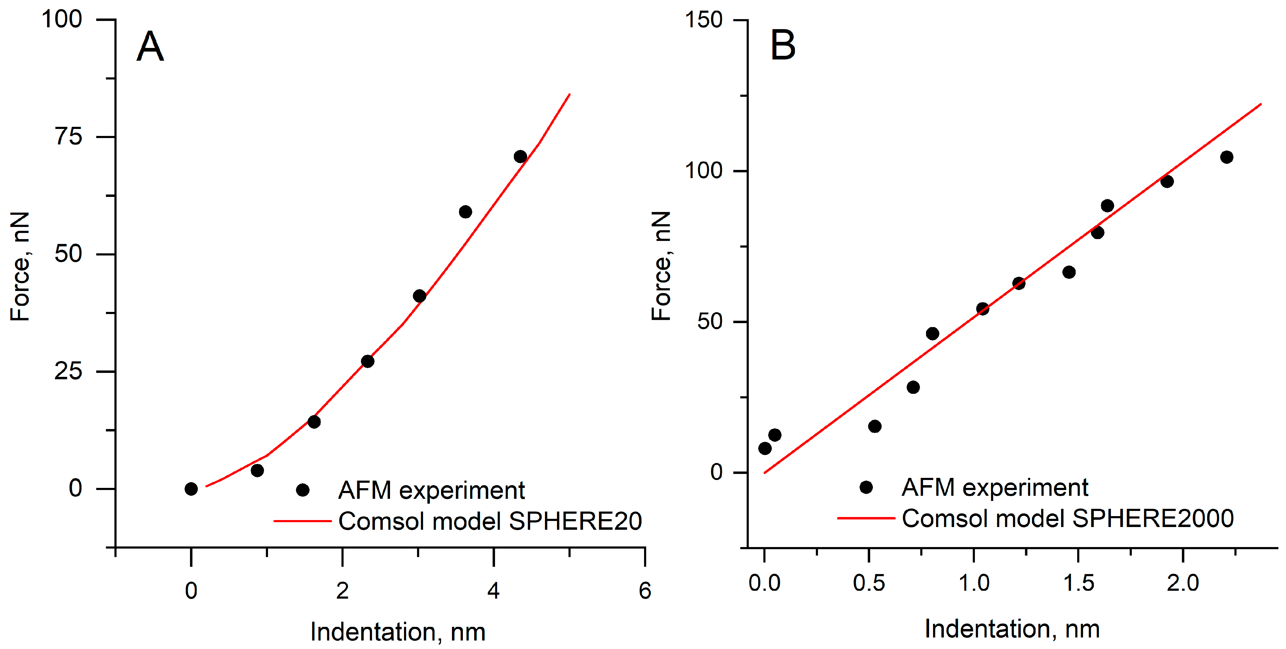 The finite element model was further evaluated using the experimental AFM indentation data for both SPHERE20 and SPHERE2000 probes. Validation was performed by directly comparing the simulated and experimental force–indentation curves under identical geometric and material conditions. The same indentation depths and tip radii were used in the simulations as in the corresponding AFM measurements.