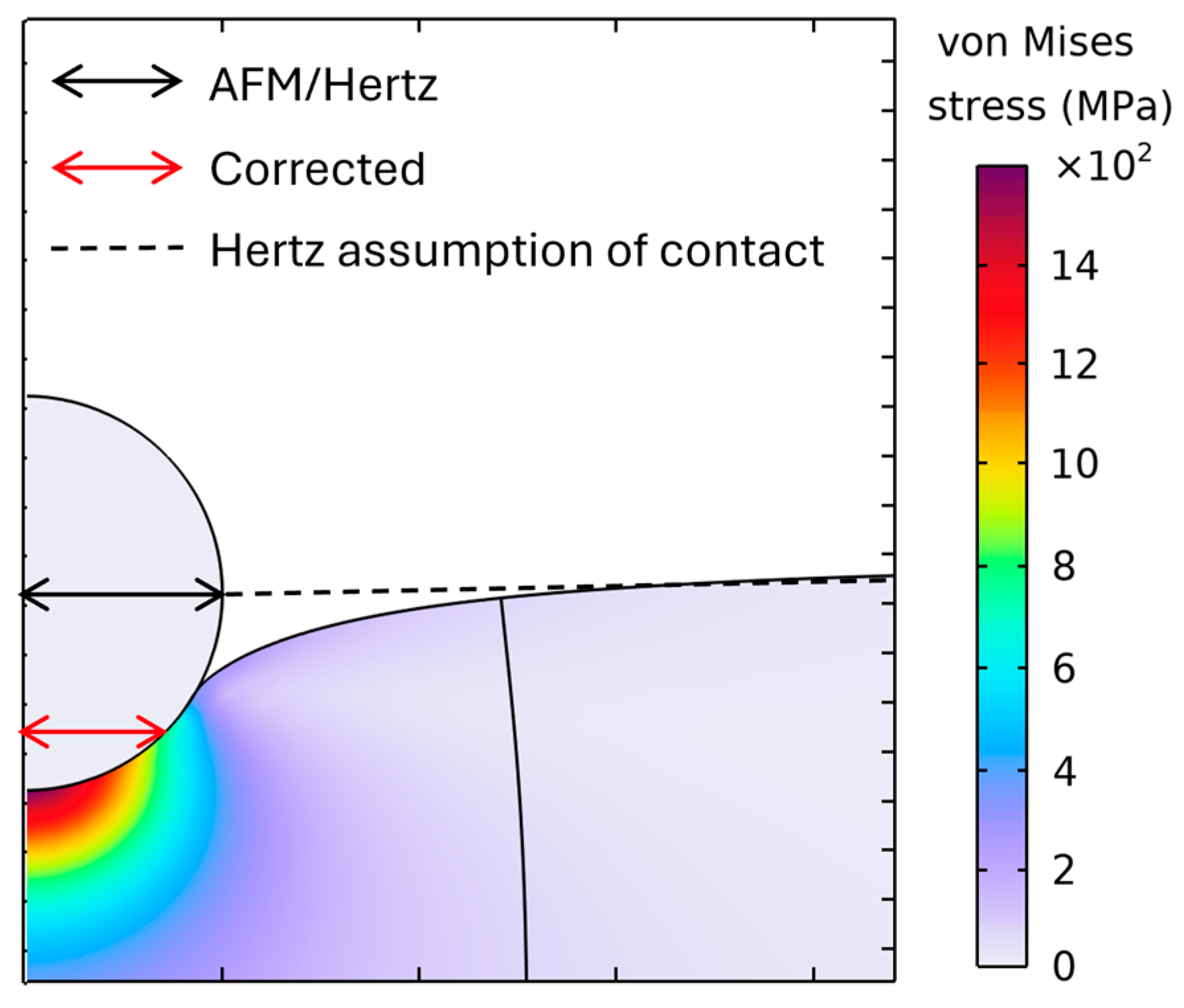 Figure 6 shows a finite element analysis of a spherical indenter on a PVC specimen. The contact patch is the high-stress zone at the interface. The dashed line marks the Hertz-assumed contact boundary, while the black arrows indicate the AFM/Hertz inferred radius, and the red arrow shows the corrected (FEA) radius. The observed FEA patch is smaller than the Hertz/geometric estimate, revealing a systematic overestimation of the contact radius. Additionally, the FEA revealed a surrounding non-pressurized deformation zone, which is not evaluated in the Hertz model. An inflated contact radius results in a lower fitted modulus from experimental force–indentation curves. In the Hertz model, which is applied for the calculation of Young’s modulus from force–indentation curves, the contact radius is not known, and only the tip radius is evaluated (Equation (2)).