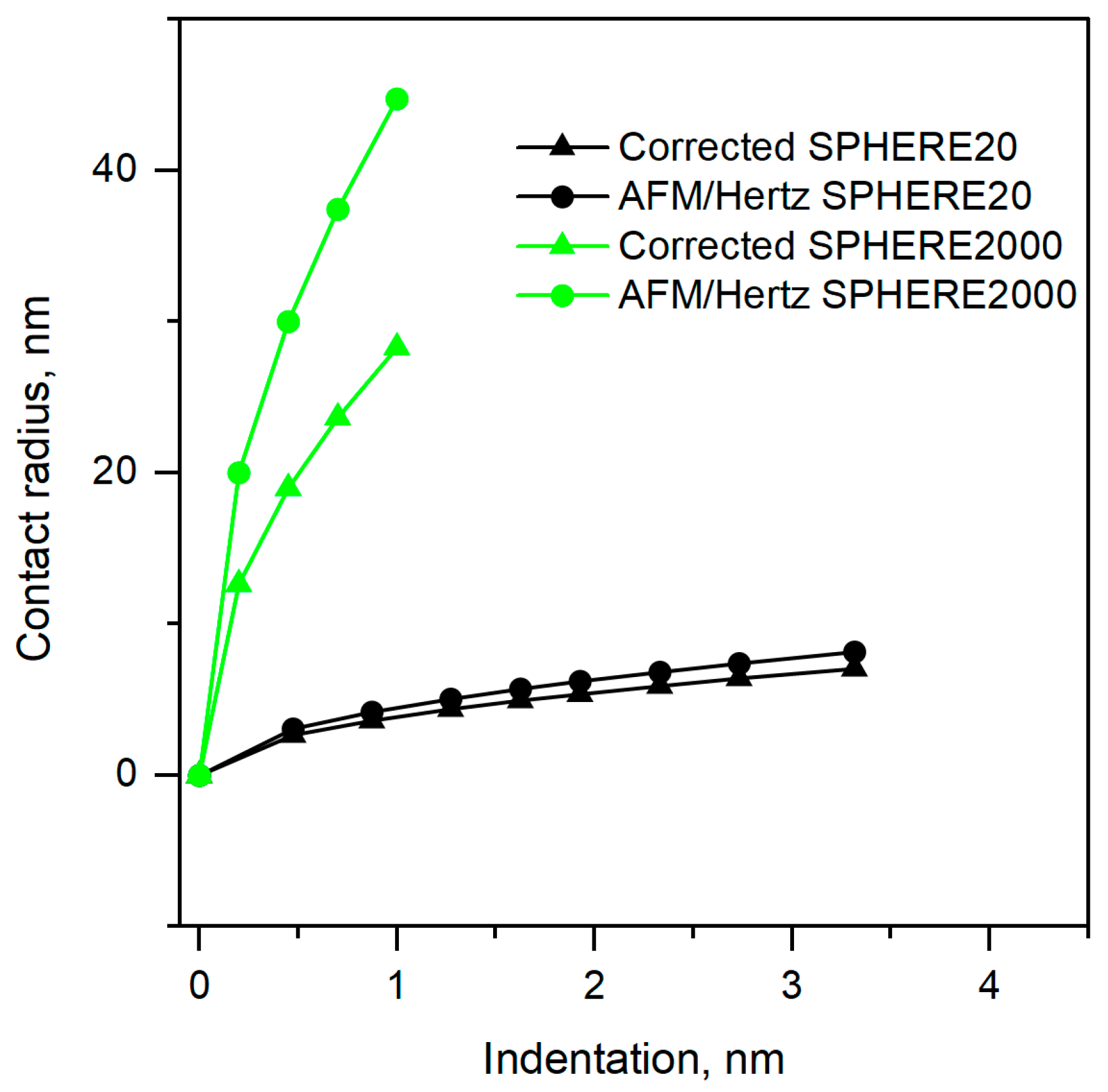 AFM/Hertz values of the contact radius were calculated using the nominal tip radius (Table 1). The indentation values for the corrected and AFM/Hertz values were taken from experimental data.