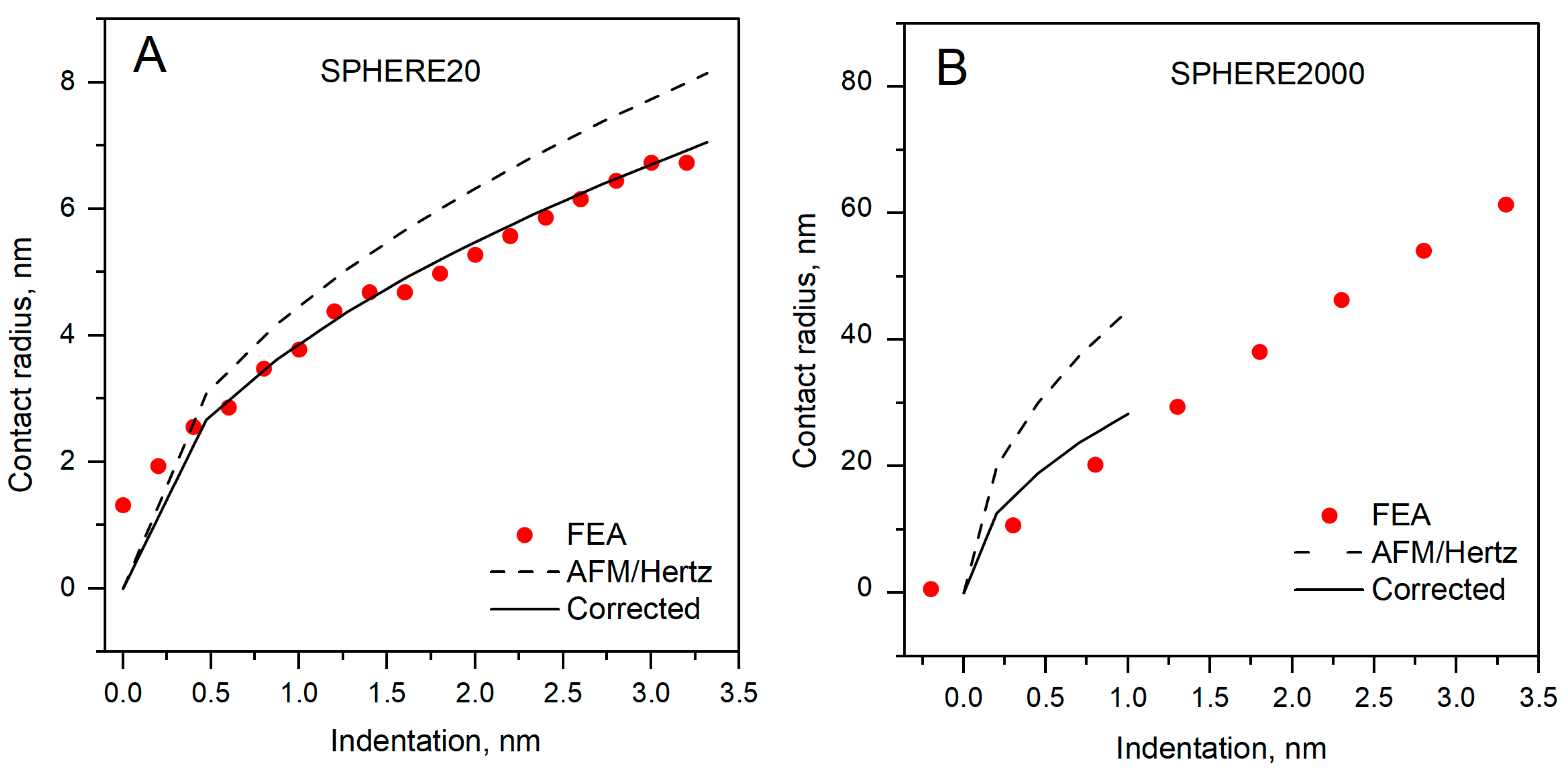 Figure 8. Contact radius dependence on indentation. (A) SPHERE20; (B) SPHERE2000.