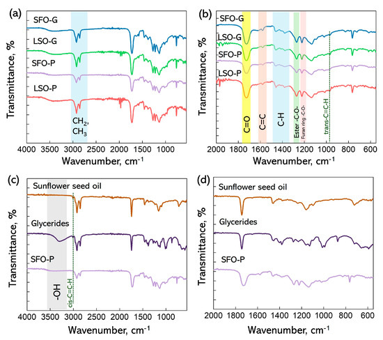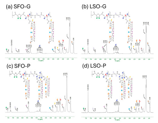 Figure 3a–d shows the 1H NMR spectra that contain the signals typical of an AR classified with letters starting from the low-field region. The potential positions of protons associated with each peak in the structures of alkyd resins, which represent possible repeating units, are identified in Figure 3 for each sample. The signal observed at δ 7.28 ppm is attributed to chloroform-d. Through the examination of the spectra acquired for the sunflower seed oil and the glycerides (Figure S2), the presence of fatty acid protons and polyol protons was noted, while signals associated with aromatic protons were absent. The synthesized AR shows that the low-field region of the spectrum at δ = 7.56–7.62 ppm (peak a) corresponds to the protons of the furan ring. The resonance observed in the range of δ = 6.53–6.55 ppm (peak b) can be attributed to the presence of maleic ester moieties. The resonance observed in the range of δ = 5.37–5.62 ppm, identified as peak c, was attributed to the vinylic protons. The signals δ = 4.13–4.64 ppm, consisting of peaks d, are attributed to the protons associated with the CH2 groups of the polyol(s). The resonance observed at approximately δ = 2.79–2.82 ppm (peak e) has been attributed to aliphatic CH2 groups that are shielded by two adjacent vinyl groups. The peaks that persist in the aliphatic region δ = 0.5–2.6 ppm are attributed to sp3 C-bound protons associated with the fatty acid chains (peaks f–k). The assignment of 1H-NMR chemical shifts in SFO-G, LSO-G, SFO-P, and LSO-P AR is: