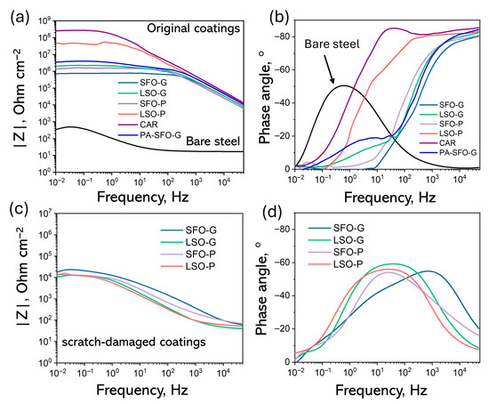 The synthesized ARs maintained the |Z|0.02Hz range from ~7.3·105 to 4.5·107 Ω·cm−2. The |Z|0.02Hz values for LSO-G, SFO-P and LSO-P exceed 106 Ω cm−2, indicating effective prevention against the erosion of corrosive media to the substrate and exhibiting high corrosion resistance, comparable to that of CAR (Figure 6a). Furthermore, the phase angle approaching 90° in the high-frequency region indicates a remarkable barrier property of the coating following 30 min of immersion (Figure 6b). The Bode graphs of the scratch-damaged samples (Figure 6c,d) illustrate a notable reduction in barrier properties and indicate substrate activity at mid to low frequencies. This aligns with the double-layer capacitance observed at the steel surface, particularly in regions exposed at the base of pores and defects or where the coating has delaminated [53]. The difference in corrosion resistance between the original samples and the scratch-damaged samples is evident.