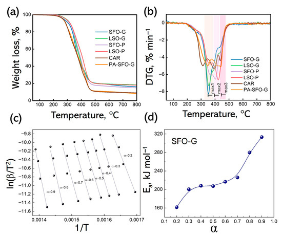 TG (a) and DTG (b) curves of FDCA-based, CAR and PA-SFO-G alkyd coatings; Fitting curves for thermodynamic equations (KAS method) (c) and plot of Ea vs conversion rate for SFO-G (d).