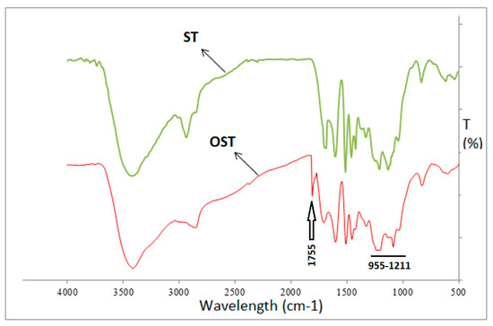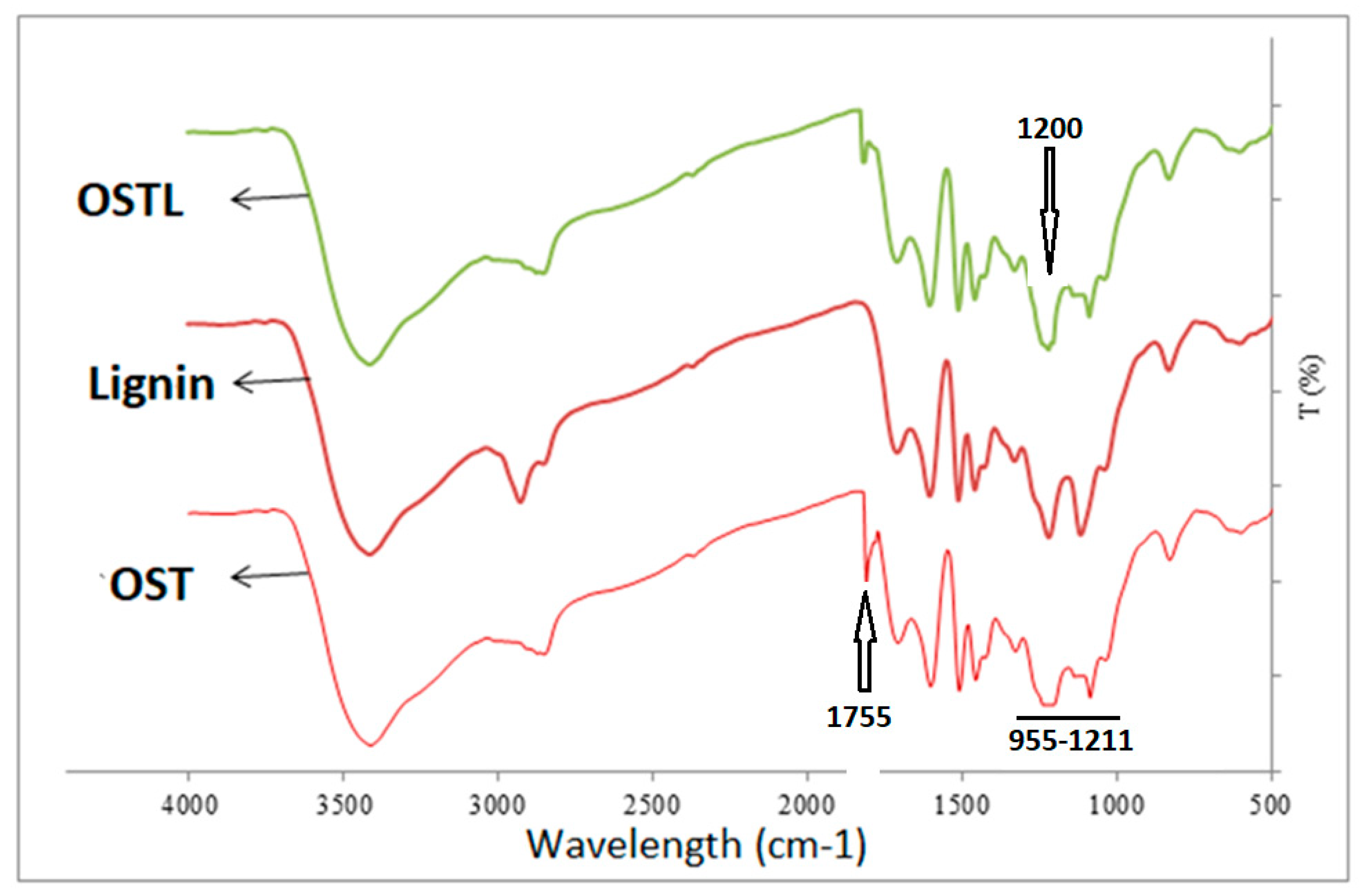 - FTIR analysis showed that the content of carboxyl groups at the 1200 cm−1 band increased after curing the OSTL resin. Even the content of carbonyl groups in the OSTL resin was lower than that in the OST resin.
