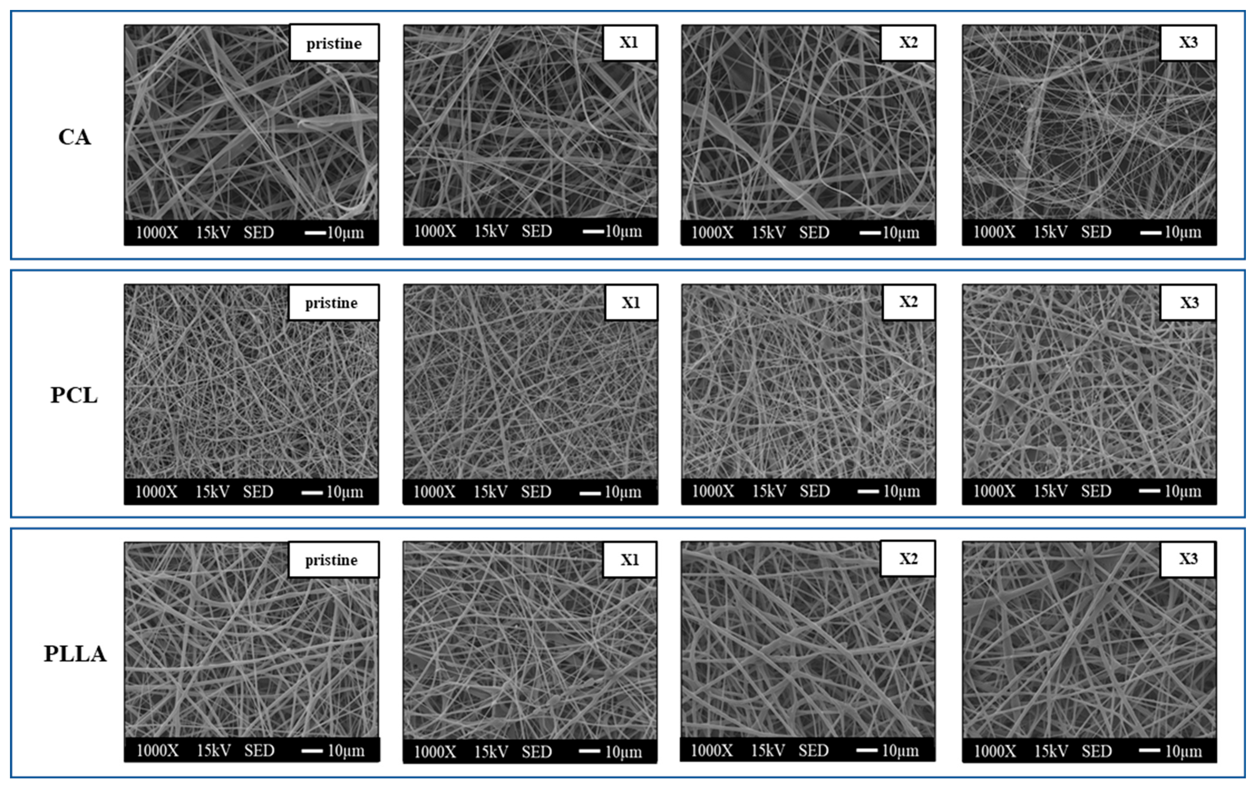- Oldal, D.G.; Topuz, F.; Holtzl, T.; Szekely, G. Green Electrospinning of Biodegradable Cellulose Acetate Nanofibrous Membranes with Tunable Porosity. ACS Sustain. Chem. Eng. 2023, 11, 994–1005. [Google Scholar] [CrossRef]