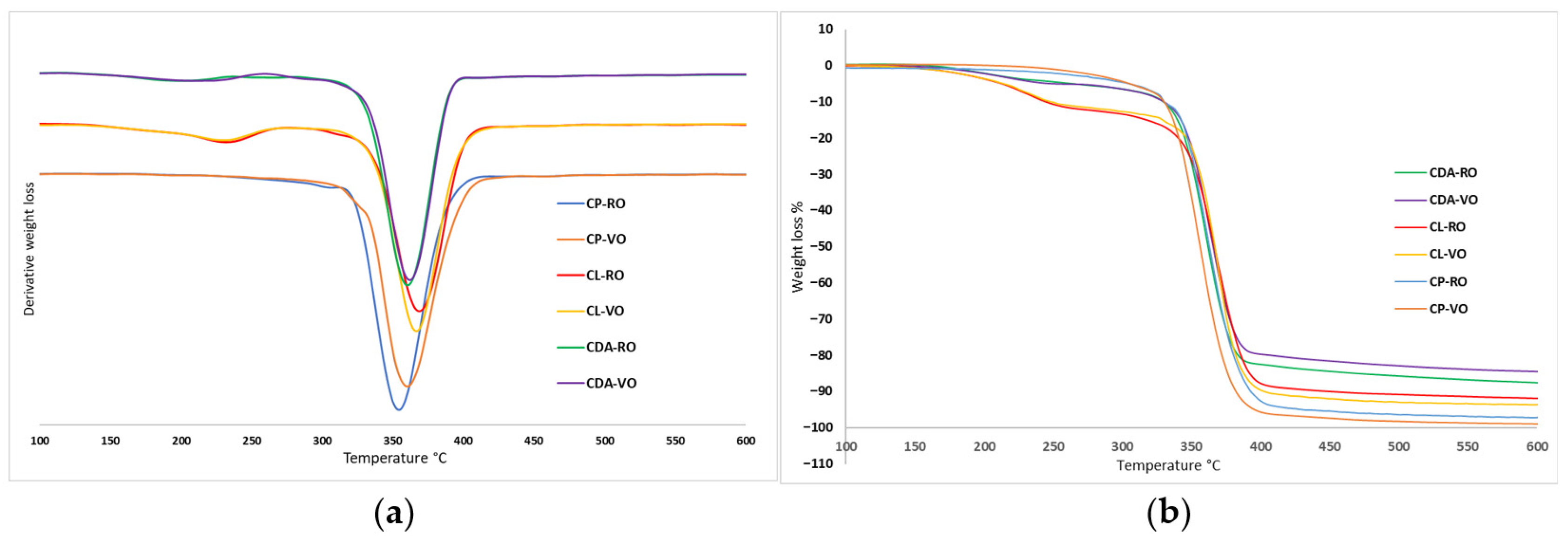 - Jandura, P.; Riedl, B.; Kokta, B.V. Thermal Degradation Behavior of Cellulose Fibers Partially Esterified with Some Long Chain Organic Acids. Polym. Degrad. Stab. 2000, 70, 387–394. [Google Scholar] [CrossRef]