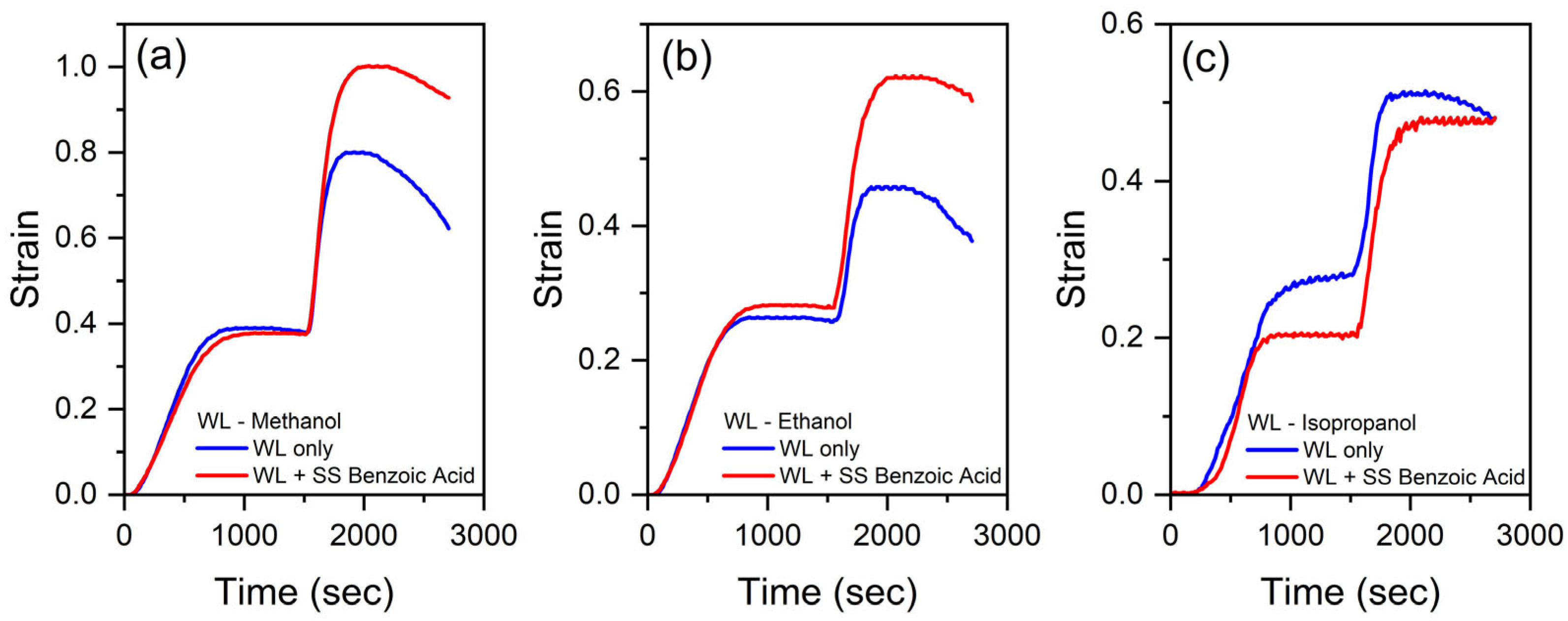 Table 3 clearly show that the SS influence is dissimilar for different alcohols used as WLs. In the case of methanol, the strain is larger than the strain for ethanol, both demonstrating ca. 20% growth. However, isopropanol and propanol strains for WL + SS are close or even less than 1. In