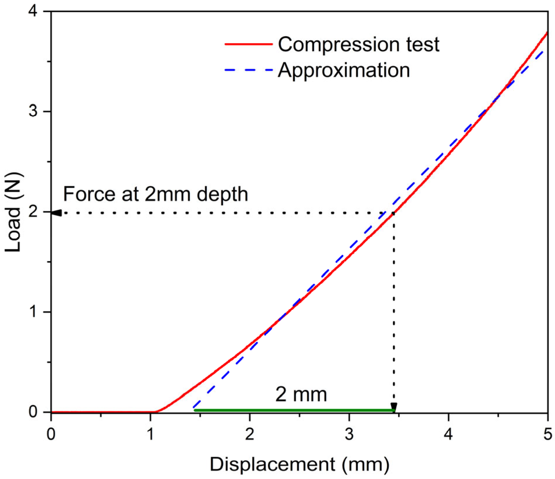 3. We used an indenter of 5 mm in diameter, positioned it in the center of the sample side surface, and registered the force of the indenter on 2 mm depth. More details of the test procedure are given in