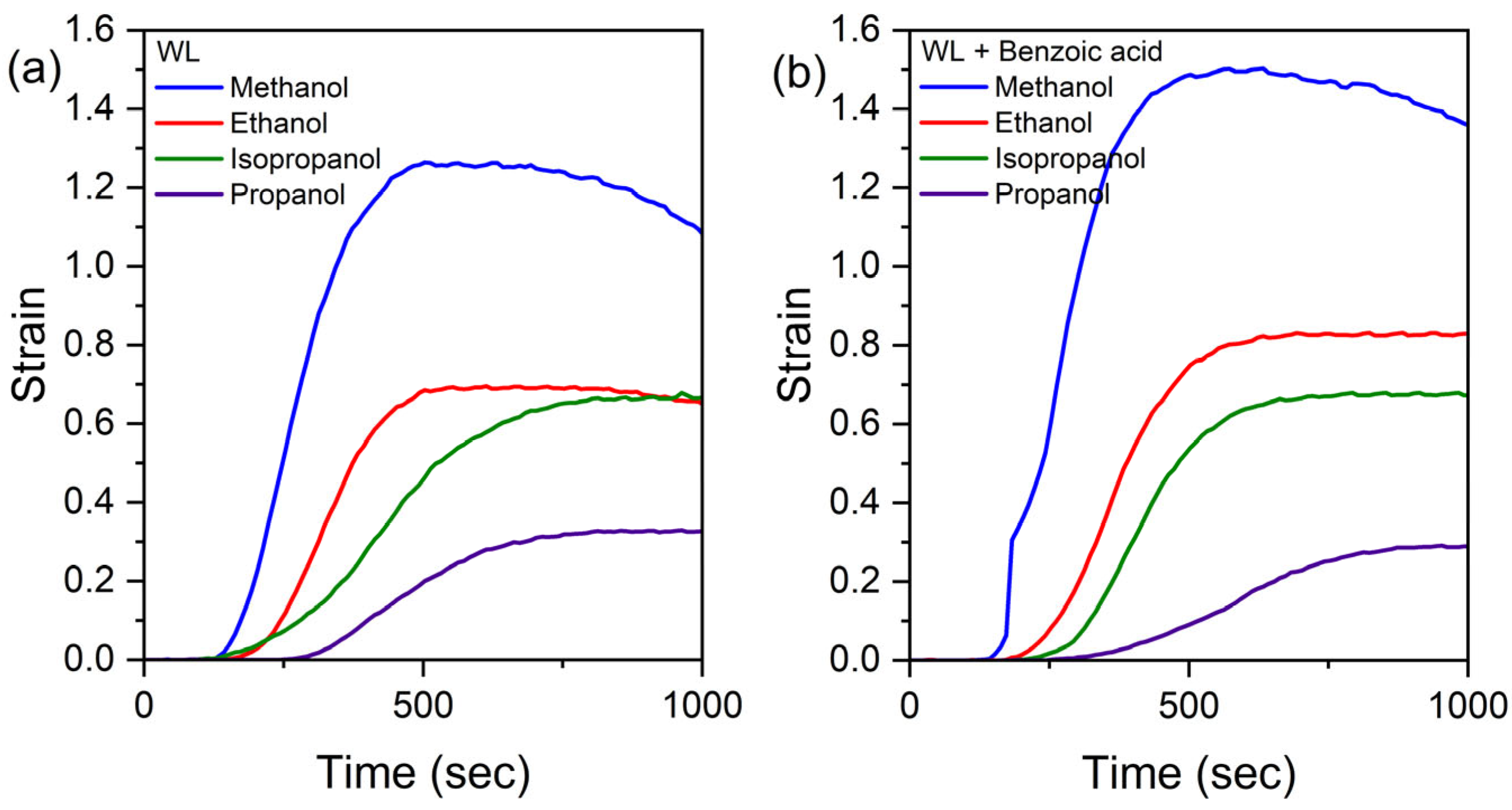 34], the strain decrease also begins earlier for the methanol samples than for the ethanol ones. Therefore, the composite actuation will last for a certain time, which depends on the WL used.