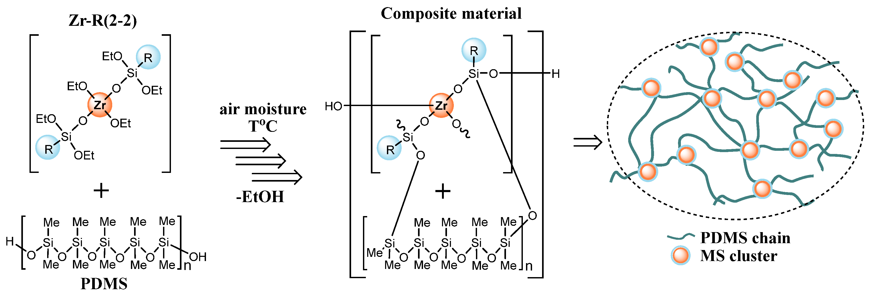 In the presented study, the highly filled MS component composites were obtained. The initial mass fraction of MS relative to the {MS + PDMS} mixture was 0.5 wt.pt. Two parallel processes are assumed to occur when carried out in the open air with the participation of atmospheric moisture: binding of linear PDMS blocks with the MS and hydrolysis and condensation of MS with each other. The presence of an initially large excess of ethoxy groups of MS oligomer in the initial mixture relative to the silanol groups of rubber ([SiOEt]:[SiOH] ~ up to 500) causes the formation of two types of networks: organic, formed from PDMS, and metallosiloxane, formed by clusters of crosslinked MS (Figure 2). The compositions were obtained in the form of films with a thickness of 0.3–0.5 mm.