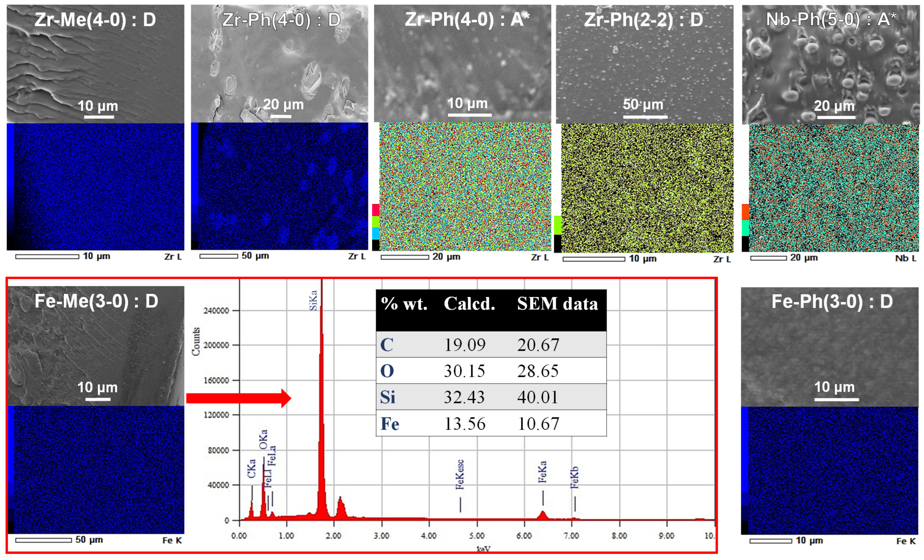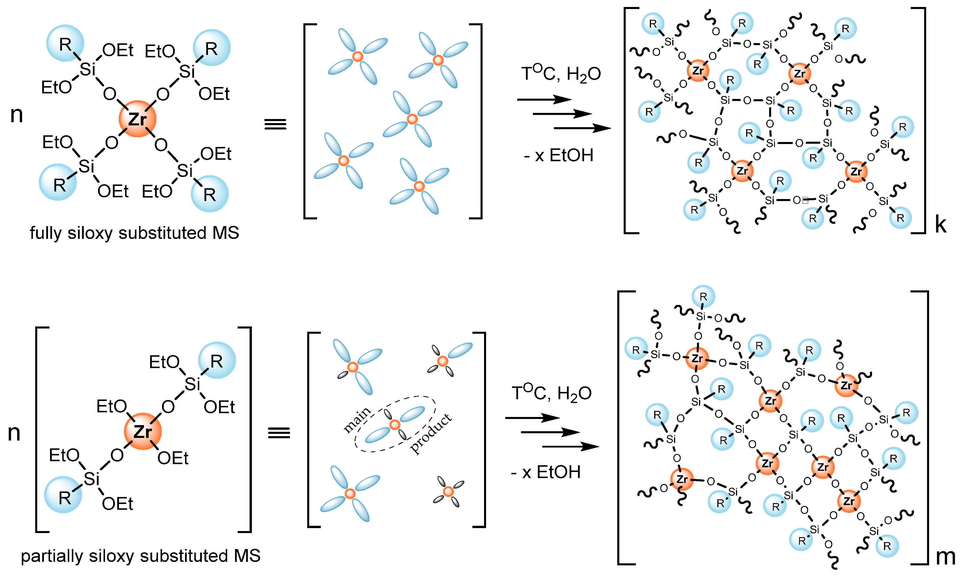 A wide range of previously synthesized metallo(organo)ethoxysiloxane oligomers were used to obtain the compositions and study their physicochemical properties. They differed in the type of metal (Fe(III), Zr, Hf, Ti, and Nb), the degree of metal shielding by the siloxy substituent, and also the organosubstituent at the silicon atom (R = Me, Ph, Vin). The synthesis of such compounds was carried out by reacting the corresponding sodium organodiethoxysilanolate (and sodium ethoxide) with a metal chloride in an organic solvent medium, provided that the molar ratio [Cl]:[Na] = 1:1 n/n was maintained, yielding completely M[OSi(R)(OEt)2]k (M-R(k-0)) or partially (EtO)mM[OSi(R)(OEt)2]p (M-R(p-m)) (alkyldiethoxy)siloxy derivatives, where M is a metal atom, R is an organic group at silicon atom, k is the valence of the metal, and m is the degree of substitution of ethoxy groups at the metal atom (Figure 1). It was previously shown that such products are close in composition to the theoretical structures; however, they contain a small percentage of the oligomeric part [32,33]. When in contact with atmospheric moisture, these compounds easily condense to form three-dimensional networks containing covalently bonded metal atoms at the nodes, shielded by siloxane sections. Along with M-O-Si and Si-O-Si bonds, in the case of partially siloxy-substituted (alkyldiethoxy)siloxy derivatives, it is possible to form M-O-M bonds.