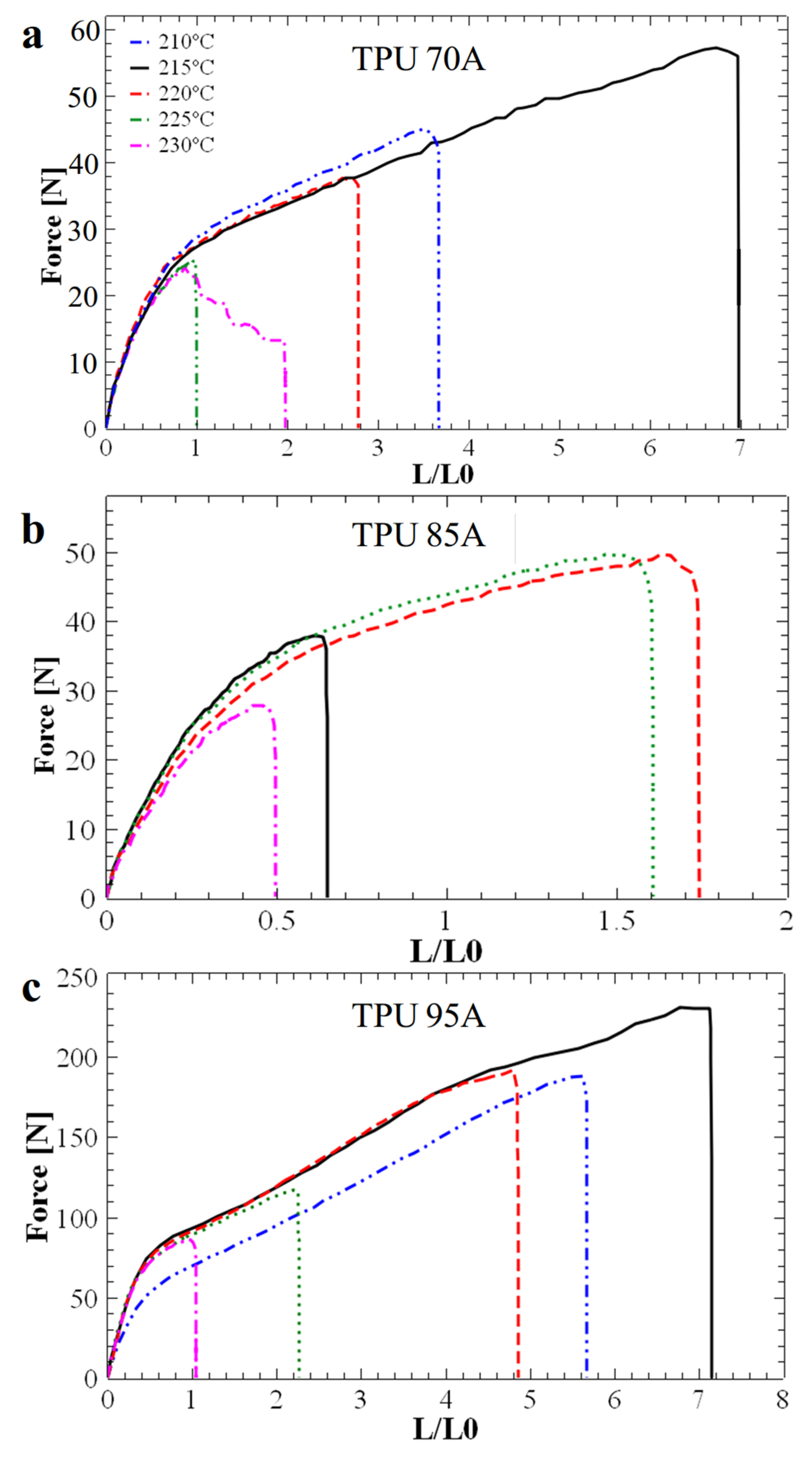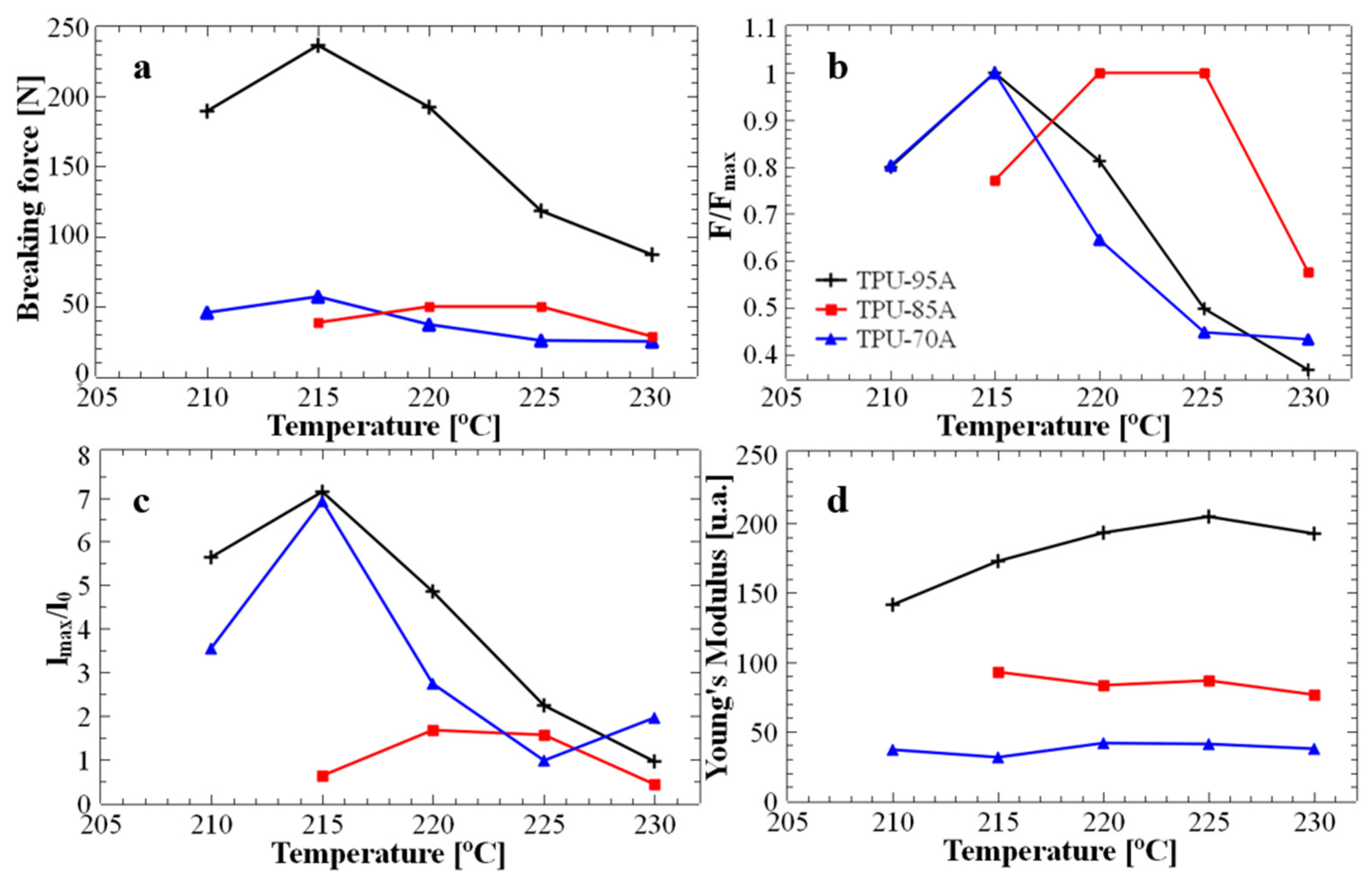 Figure 2b, it was observed that the maximum breaking force for the TPU 70A and TPU 95A structures occurred at 215 °C. In contrast, for the TPU 85A structure, the maximum breaking force was observed at printing temperatures ranging between 220 °C and 225 °C. These results indicated that, in most cases, samples printed at 215 °C exhibited the best interlayer adhesion and higher overall print quality, as reflected by the superior force at which the samples failed. Furthermore, to study the final quality of the polymeric samples after exposure to different printing temperatures (considering that excessive temperatures could lead to material degradation), we determined the maximum elongation for all standard tensile specimens. This characteristic is important for reusable materials because it may indicate their ability to return to their original shape.