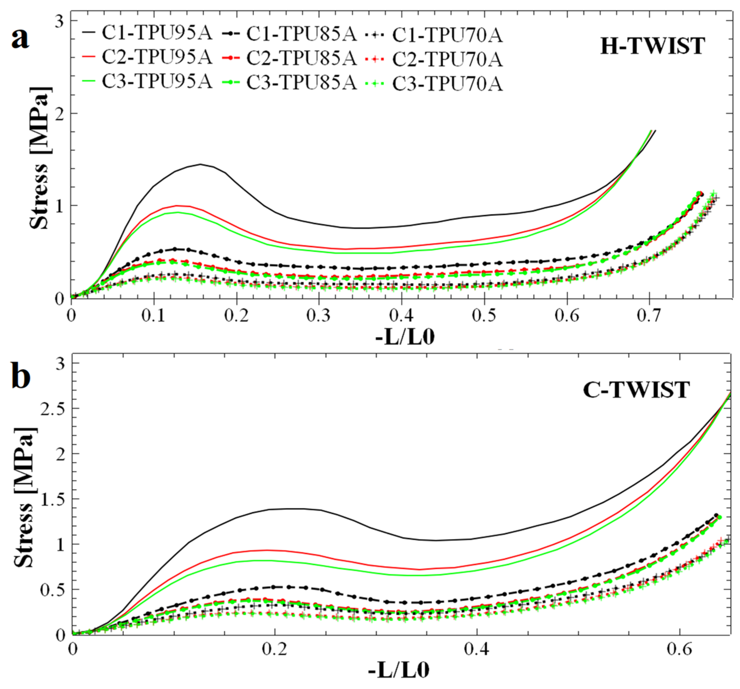 Figure 7a–c, the twisted structures (H-twist and C-twist) exhibited, on average, higher CLE values, i.e., values closer to 1. In comparison the CLE values corresponding to the non-twisted counterparts were generally lower (except possibly for the hexagonal structures made from TPU 95A), i.e., further away from 1. Introducing a twist reduces the instantaneous peak stress and total absorbed energy but increases crushing load efficiency (CLE). This behavior is consistent with a transition from abrupt cell wall engagement to a more gradual, distributed deformation. Therefore, twisting promotes progressive loading of successive cell walls, improving CLE at the expense of initial load-bearing capacity.
