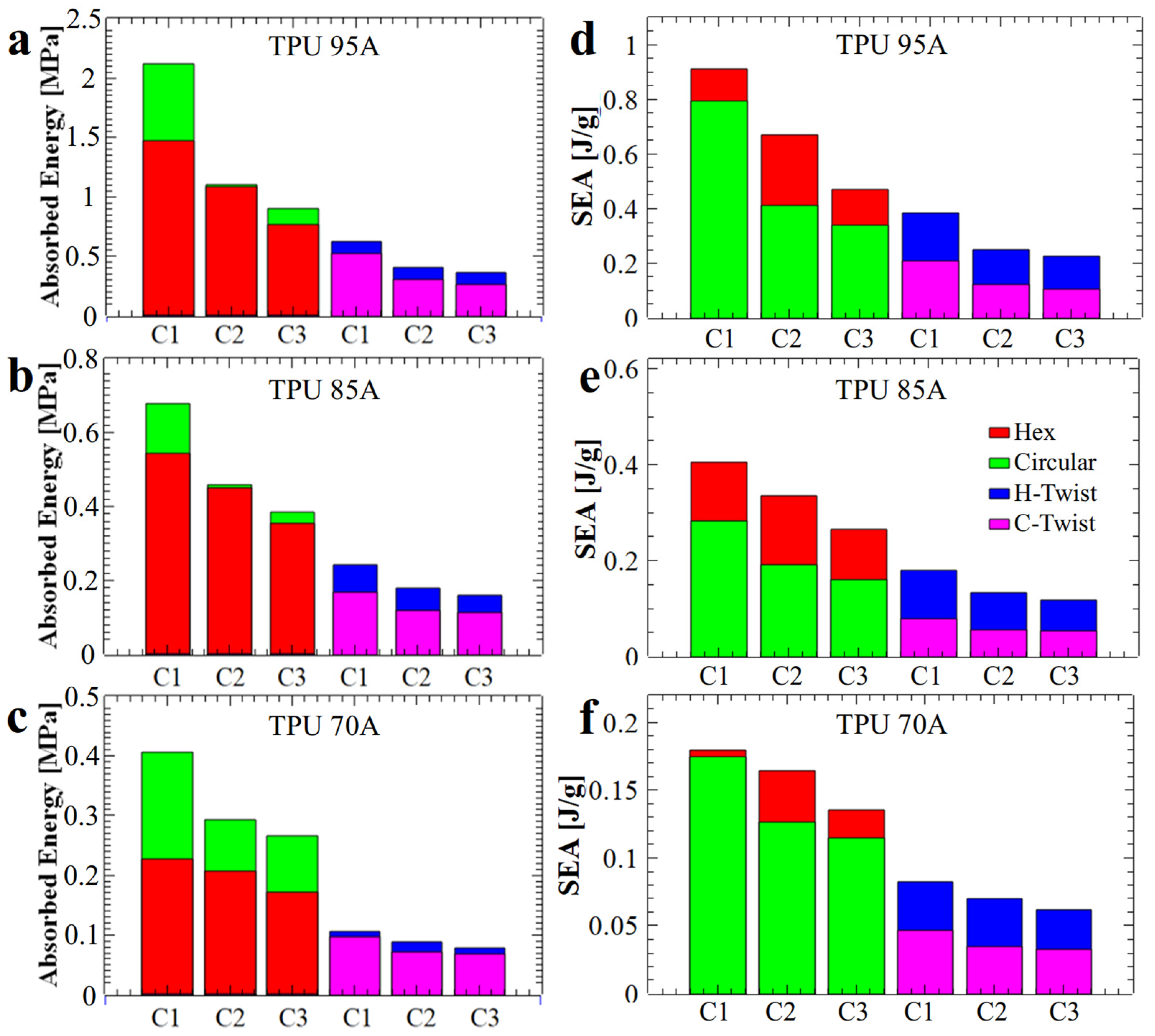 Figure 7a, the structure with hexagonal holes made from TPU 95A demonstrated the best overall energy absorption properties. The energy absorbed by this structure was 1.5 MPa in terms of stress and 0.91 J/g in terms of specific absorbed energy. Thus, TPU 95A appears to be a more versatile material, capable of exhibiting a wide range of the maximum compression force values. Alongside the TPU 95A, another structure that efficiently absorbs mechanical energy is the twisted structure with hexagonal holes, produced from TPU 85A. This structure demonstrated an energy absorption efficiency of 46% (
