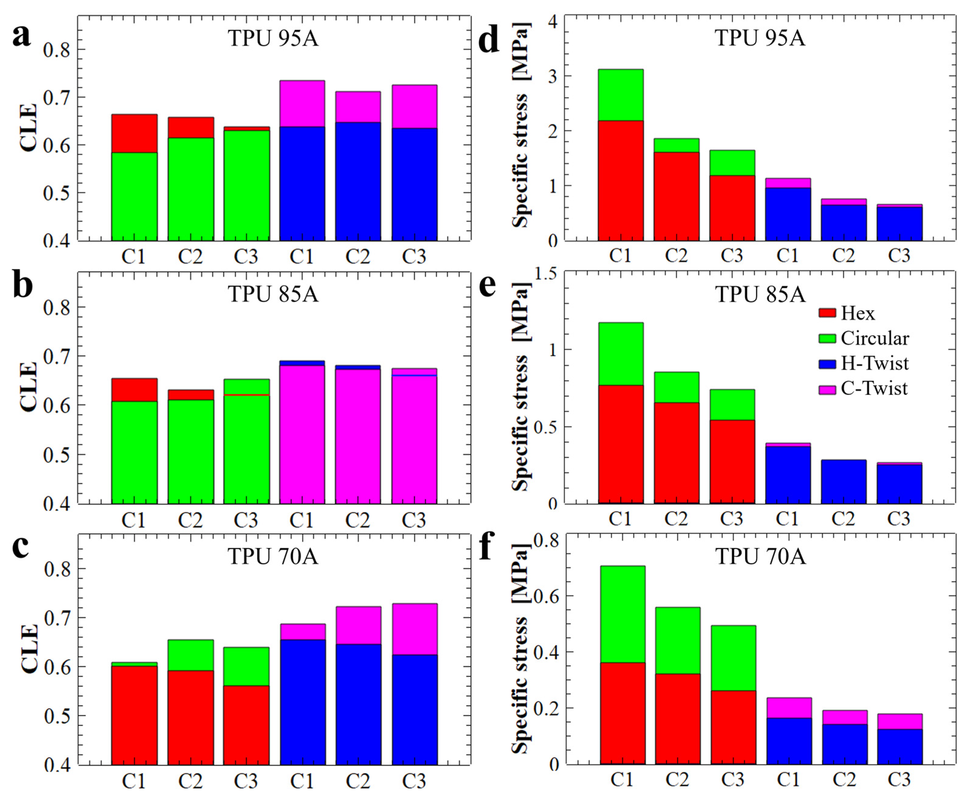 Figure 7a), while the H-twist structure fabricated from TPU 85A displayed a CLE value of 0.69 (i.e., 69%,