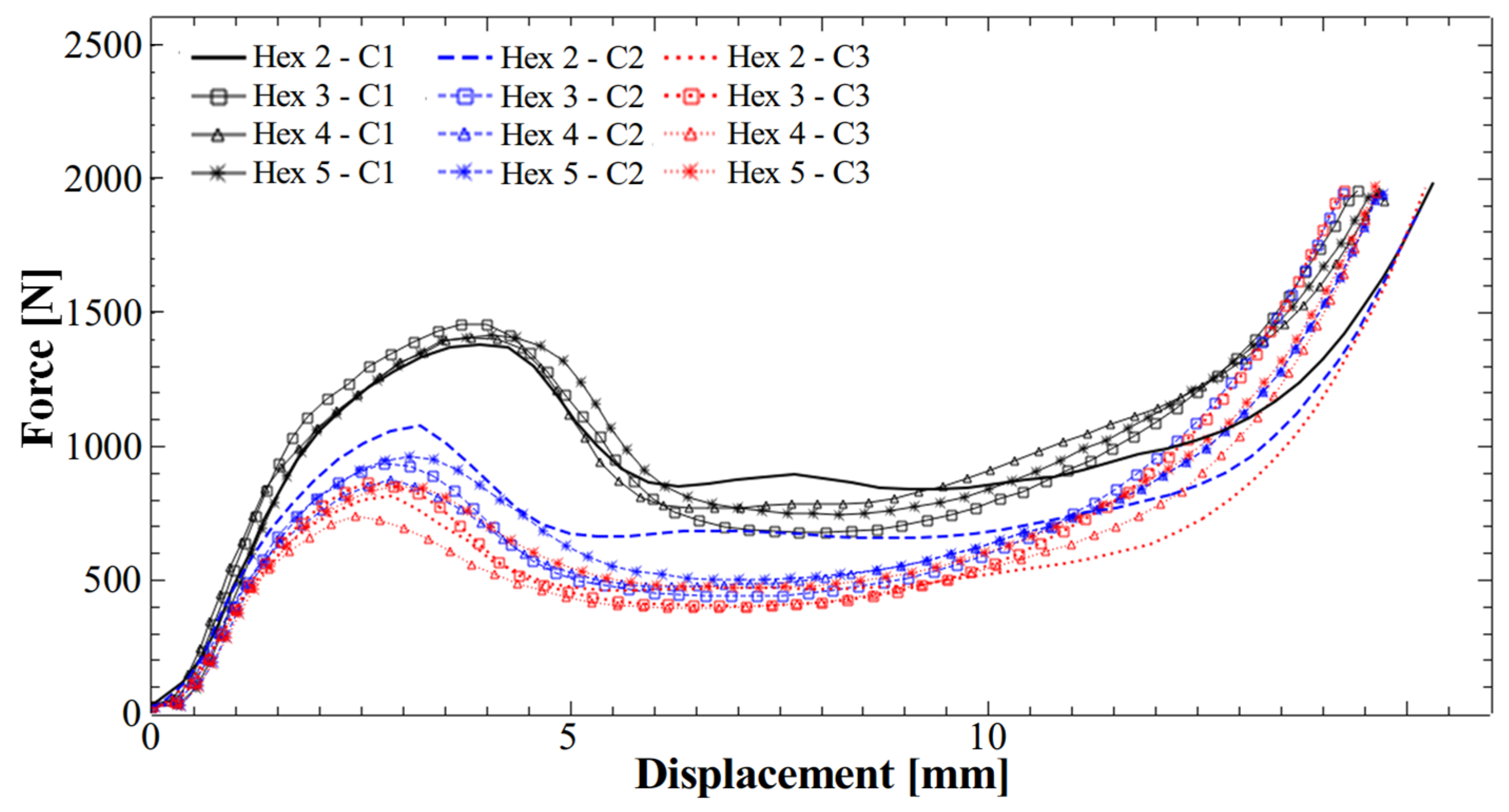 Figure 8 shows that the specific compression curves for structures with hexagonal holes remained consistent across all four samples, indicating good reproducibility. Additionally, all compression curve profiles were smooth, suggesting that the structures did not exhibit successive wall failures, even after three compression cycles. In contrast, compression curves reported in similar studies exhibited multiple peaks within the linear plateau region [