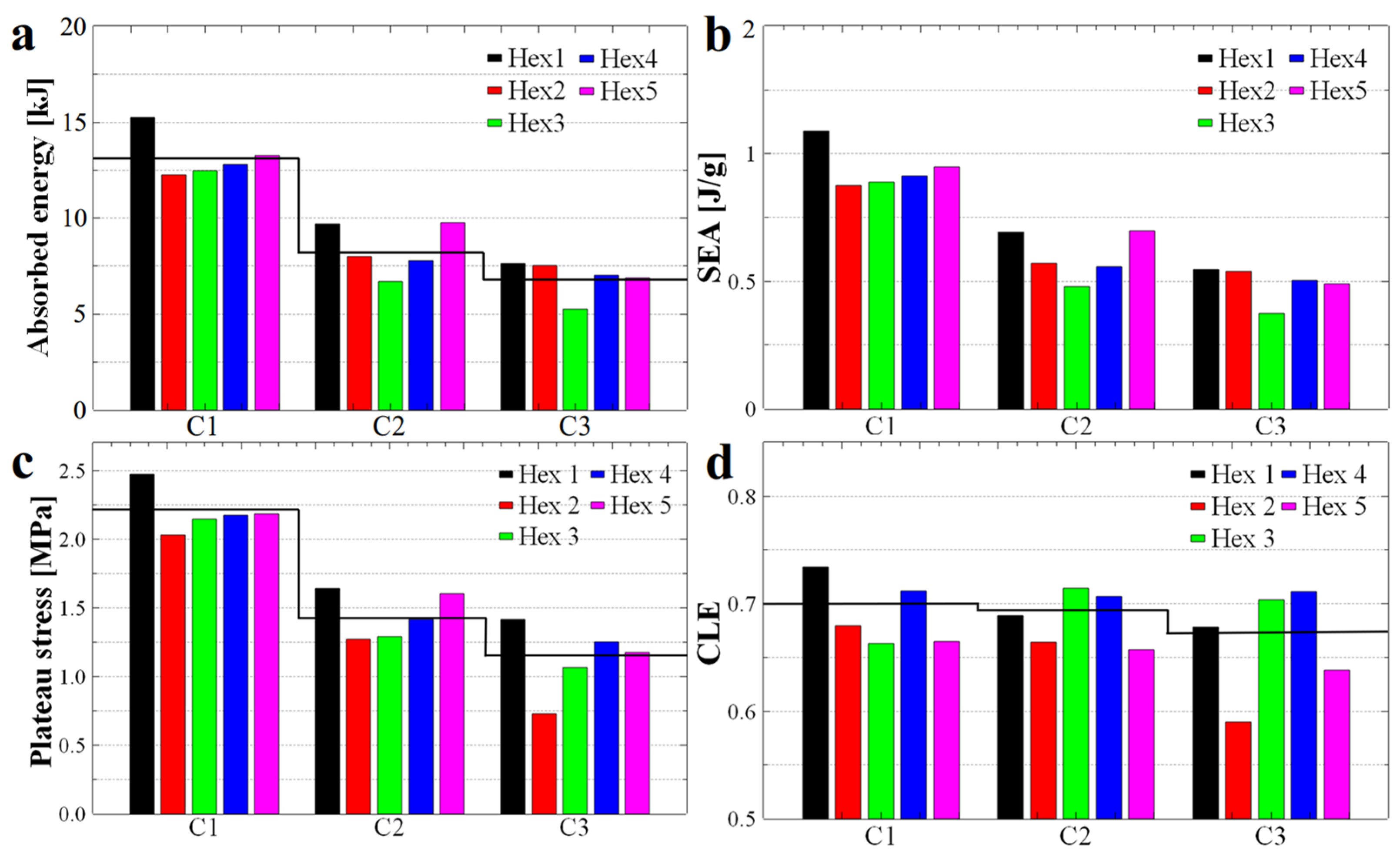 Figure 7b). Although the Hex structure demonstrated outstanding performance across the previously evaluated parameters, its CLE value did not reach a higher level. Nevertheless, the recorded value remained very close to the theoretical maximum, confirming the structure’s overall superior energy absorption behavior.