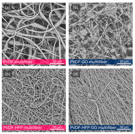 SEM image of multifiber pristine PVDF (a), PVDF with 10 wt% of GO NPs (b), PVDF-HFP (c), and PVDF-HFP with 10 wt% GO (d).