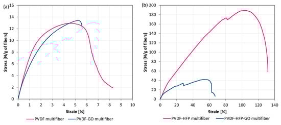 The mechanical properties of the multifibers were obtained by applying a tensile strength test, measuring the stress as a function of the strain. Figure 5 reports the obtained results for PVDF multifiber with and without GO (a) and those for PVDF-HFP multifiber with and without GO (b). The mechanical properties of the multifiber systems revealed substantial differences depending on the polymer matrix and the incorporation of GO.