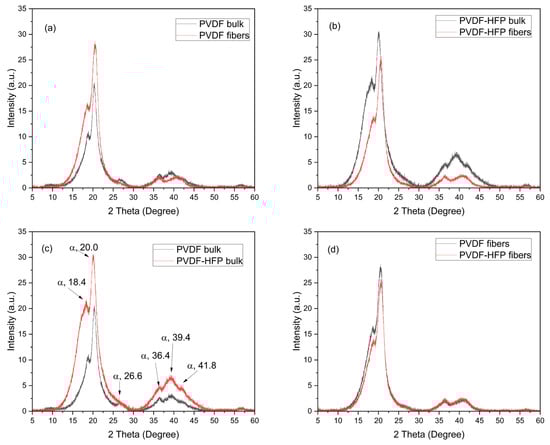 XRD spectra relative to the comparison PVDF bulk and fibers (a), PVDF-HFP bulk and fibers (b), PVDF and PVDF-HFP bulk (c), and PVDF and PVDF-HFP fibers (d).