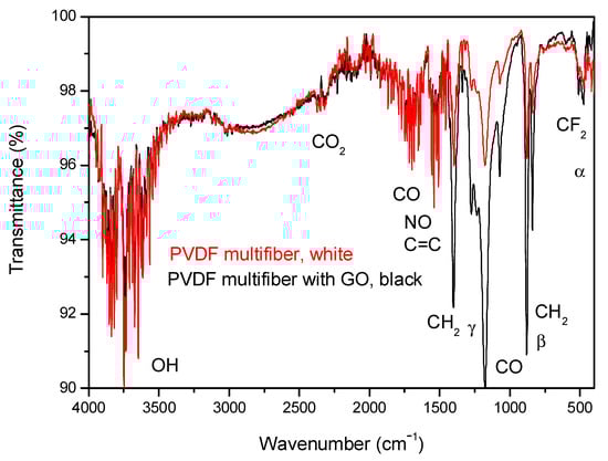 A further analysis of the characterization of the four multifiber polymers, including the PVDF-based one, has been performed using ATR-FTIR spectroscopy. Figure 7 reports the FTIR transmittance spectra comparison between the investigated multifiber polymers: PVDF multifiber, with a white color, and PVDF multifiber with 10 wt% GO, with a black color. The average transmittance is about 98% with a slight decrease for the black PVDF due to its inclusion of GO absorbent gas, water vapor, and CO groups.