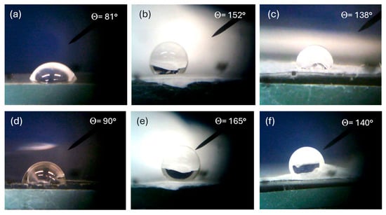 All such polymers are hydrophobic, but their degree of hydrophobicity depends on the composition and morphology of the surface. Figure 9 reports a lot of optical microscope photos of a 2 mL distilled water drop deposited on the surface of different types of polymers. In particular, Figure 9a shows the contact angle with the bulk PVDF surface of 81°, Figure 9b that of PVDF multifiber of 152°, and Figure 9c that of PVDF multifiber with 10 wt% GO nanoparticles, of 138°. Thus, for this polymer, the hydrophobicity increases significantly from the bulk morphology to the phase of electrospun multifiber and then decreases due to the insertion of the GO nanoparticles. Similar results, but with a higher hydrophobicity, have been obtained for the PVDF-HFP polymer, showing a contact angle of 90° for the bulk version, 165° in the case of PVDF + HFP multifiber, and 140° for the PVDF + HFP + 10 wt% GO.