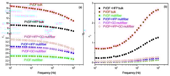 The dielectric constant measurements performed on the various investigated polymers have been compared, and the results, plotted as a function of frequency and type of polymer, are summarized in Figure 10 []. Figure 10a reports the dielectric real constant e1 as a function of the frequency and of the type of analyzed polymer. The bulk matter has a higher dielectric constant (of the order of 10–17) than the multifiber (of the order of 2.4–3.4), as expected due to the presence of air and water vapor between the fibers. The insertion of HFP and GO in PVDF enhances the dielectric constant. Figure 10b reports the dielectric imaginary constant e2 as a function of the frequency and of the type of analyzed polymer. Also, in this case, the bulk matter has a higher dielectric constant than the multifiber, and the insertion of HFP and GO in PVDF enhances the dielectric imaginary constant, maintaining the order observed for the real component.