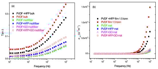Figure 11a reports the comparison between the measurements of tan d vs. frequency and polymer type. The tan δ has higher values for the PVDF and PVDF + HFP bulk foils and minor values for the multiwfiber polymers, of which the higher value is obtained for the PVDF + HFP + GO, maintaining the previous reported order. From such data, it is possible to evaluate the weak electrical conductivity of the different polymers vs. frequency, as reported in Figure 11b. For all polymers, the electrical conductivity is practically zero from low frequency up to about 1 MHz; only for higher frequencies it shows some increment at values of the order of 10−4/Ωm.