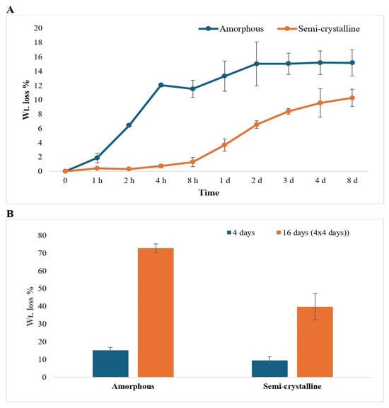 Weight loss percentage of (A) amorphous and semi-crystalline PLA for 0 h to 7 d (h: hour; d: day) and (B) amorphous and semi-crystalline PLA for 4 days and 16 days (4 × 4 days). Enzyme treatment for 16 days represents the experiment that was repeated 4 times, with 4 days of incubation between each treatment. The data are represented as means of three (triplicate) independent experiments, with error bars representing the standard deviations.