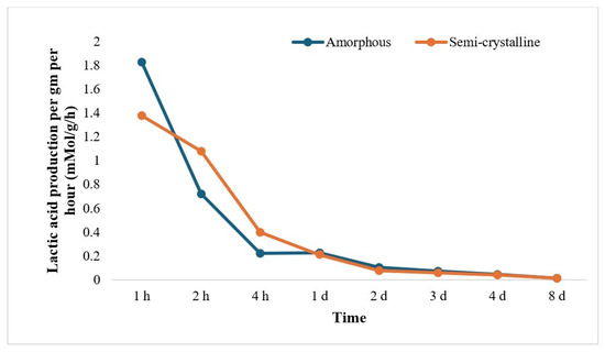 The rate of LA release (mMol/g/h) was calculated from the weight loss per gram of PLA film and LA concentration from HPLC data and was found to decrease as the incubation time increased. The trend of LA release per gram and per hour was observed to be at the maximum in the beginning (~1.8 mMol/g/h for amorphous PLA and ~1.4 mMol/g/h for semi-crystalline PLA) and was almost negligible after 2 days of treatment for both amorphous PLA and semi-crystalline PLA (Figure 4).