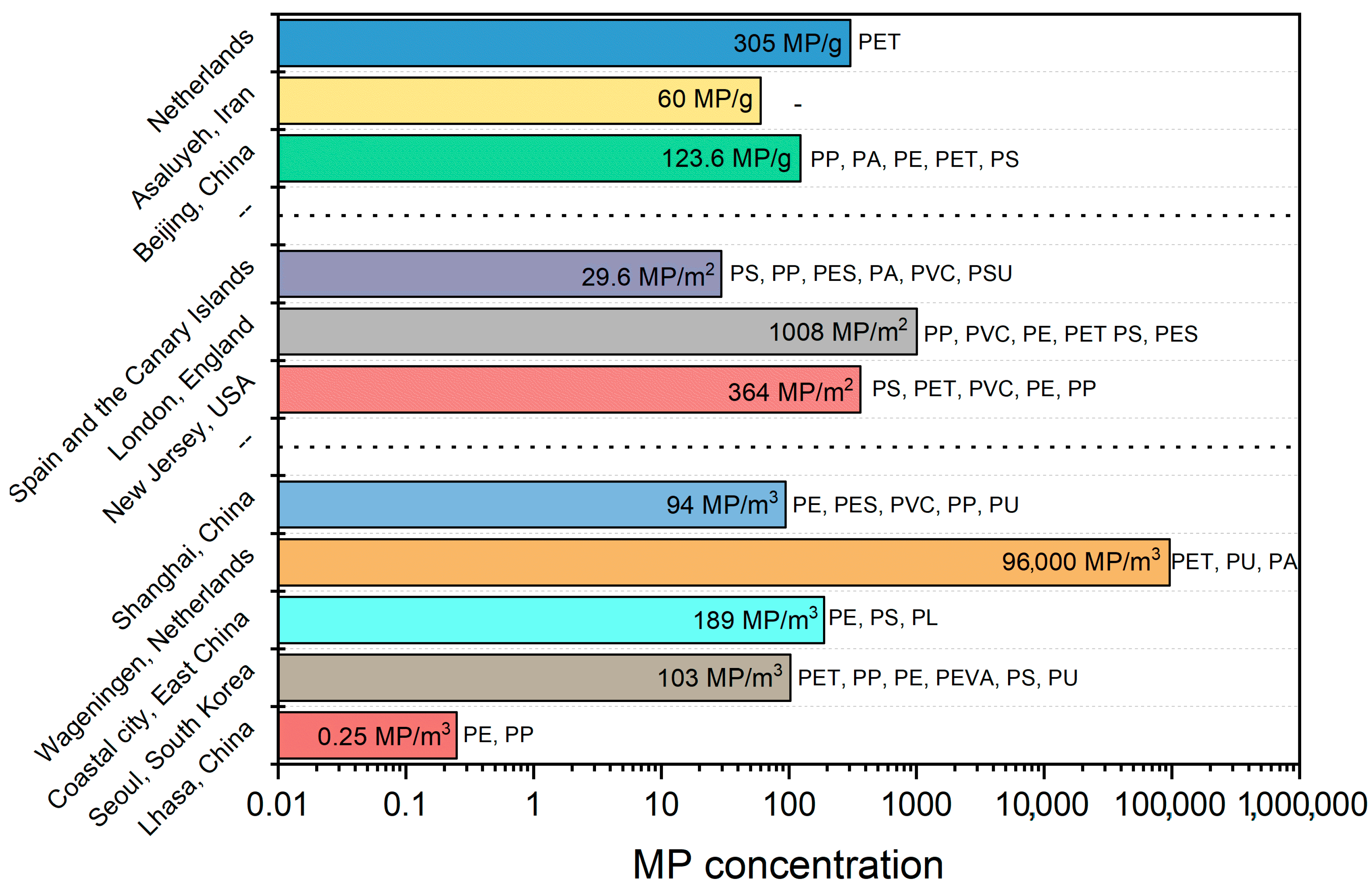 | Seoul, South Korea | 103 MP/m3 | PET, PP, PE, PEVA, PS, PU | <100 | [33] |