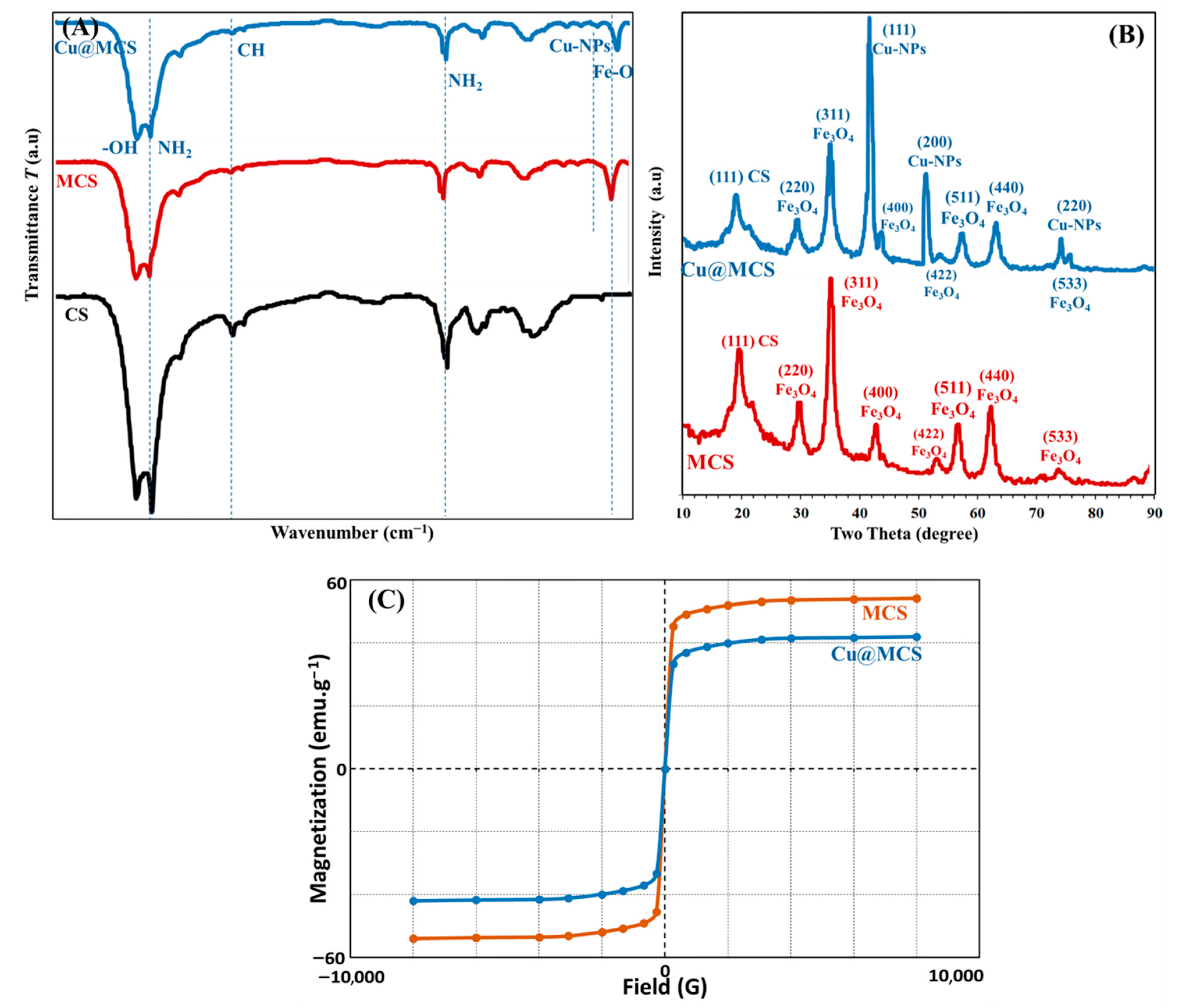 Using HRTEM and SEM, the surface morphologies of MCS nanosheets and the Cu@MCS nanocomposite were investigated; the resulting images are shown in Figure 2A–D. A vertical, compacted stack morphology and wrinkled structure appeared in the scanning electron micrograph of MCS (Figure 2A). Agglomeration of MCS with wrinkled films was reduced, to some degree, by the immobilized copper nanoparticles (Figure 2B). Figure 2C,D show HRTEM images of MCS and Cu@MCS, which reveal dark patches on the MCS sheets, which are magnetite and Cu-NPs moieties. The 3D Cu@MCS nanocomposite’s thicker, rougher, and more inconsistent surface, as well as its more random 3D porous arrangement, demonstrates that the MCS surface was effectively doped with Cu-NPs. The Cu@MCS nanocomposite has an average diameter of 25.3 ± 1.5 nm. The N2 adsorption/desorption hysteresis loop of the Cu@MCS nanocomposite is shown in Figure S1. Hysteresis loop analysis shows that the Cu@MCS nanocomposite has a microporous structure, which causes a considerable increase in pressure at relatively low pressures (P/Po < 0.05 atm). In addition, the presence of mesopores is shown by the BET isotherm, which shows type IV with an H4 hysteresis loop. The specific surface area and total pore diameter were measured to be 414.33 m2∙g−1 and 5.40 nm, respectively. Figure 2E,F show the results of the elemental analysis, which verify the chemical purity of the porous Cu@MCS nanocomposite, as well as the presence of magnetite and Cu dopant. The EDX spectrograph of the nanocomposite shows three different peaks of Cu nanoparticles (Figure 2E). The first peak is at 0.93–1.21 keV (Lα1), the second and largest peak is at 7.95–8.31 keV (Kα), and the third peak is at 8.78–8.93 keV (Kβ). Additionally, at 0.58–0.67, 6.28–6.71, and 6.92–7.22 eV, the three distinctive peaks of the magnetite nanoparticles are detected. Figure 2F shows the results of the EDS mapping, which indicate the distribution of Cu-NPs and Fe, O magnetite throughout the Cu@MCS nanoparticles. The EDS spectra confirm the presence of Cu loading on the magnetic chitosan nanoparticles. Figure 3A shows the Fourier transform infrared spectra of the MCS and Cu@MCS nanostructures. At the 3471–3512 cm−1 range, the stretching vibration of O-H in MCS and Cu@MCS was identified. The C-H stretching vibrations of the -CH2- groups in the chitosan polymer backbone are connected to the absorption bands at 2927–2944 cm−1 in MCS and Cu@MCS. At 3414–3417 and 1615–1627 cm−1, the typical biosorption peak of primary amine (-NH2) is visible. C-O bond stretching vibration is shown by the bands at 1030–1075 cm−1. At 607.5 cm−1, the immobilized Cu-NPs onto the Cu@MCS nanocomposite show their most unique peak, whereas the peak at 581.4 cm−1 is assigned to the stretching vibration of the Fe-O in the magnetite. Cu nanoparticles are shown to be immobilized on MCS nanostructures by FTIR spectroscopy. In Figure 3B, XRD results validate the Cu@MCS nanocomposite’s structure. The three diffraction peaks observed in Cu@MCS, namely at 43.94° (111), 51.21° (200), and 75.02° (220), are quite close to the typical Cu card (JCPDS Card: 04-0836) [66]. The CS sheets are responsible for the extra broad (111) peak at around 19.91–20.02° [67]. The magnetite nanoparticles in MCS and Cu@MCS exhibit six distinct diffraction peaks, which align with the standard Fe card (JCPDS Card: 19-0629) at 30.20–30.37° (220), 35.53–35.60, 43.94–43.40, 53.20–53.63° (511), 62.74–62.77°, and 73.38–74.31° (533) [68]. The nanocomposite’s XRD spectrogram displays no extra peaks, suggesting that the fabricated nanocomposite is highly pure.