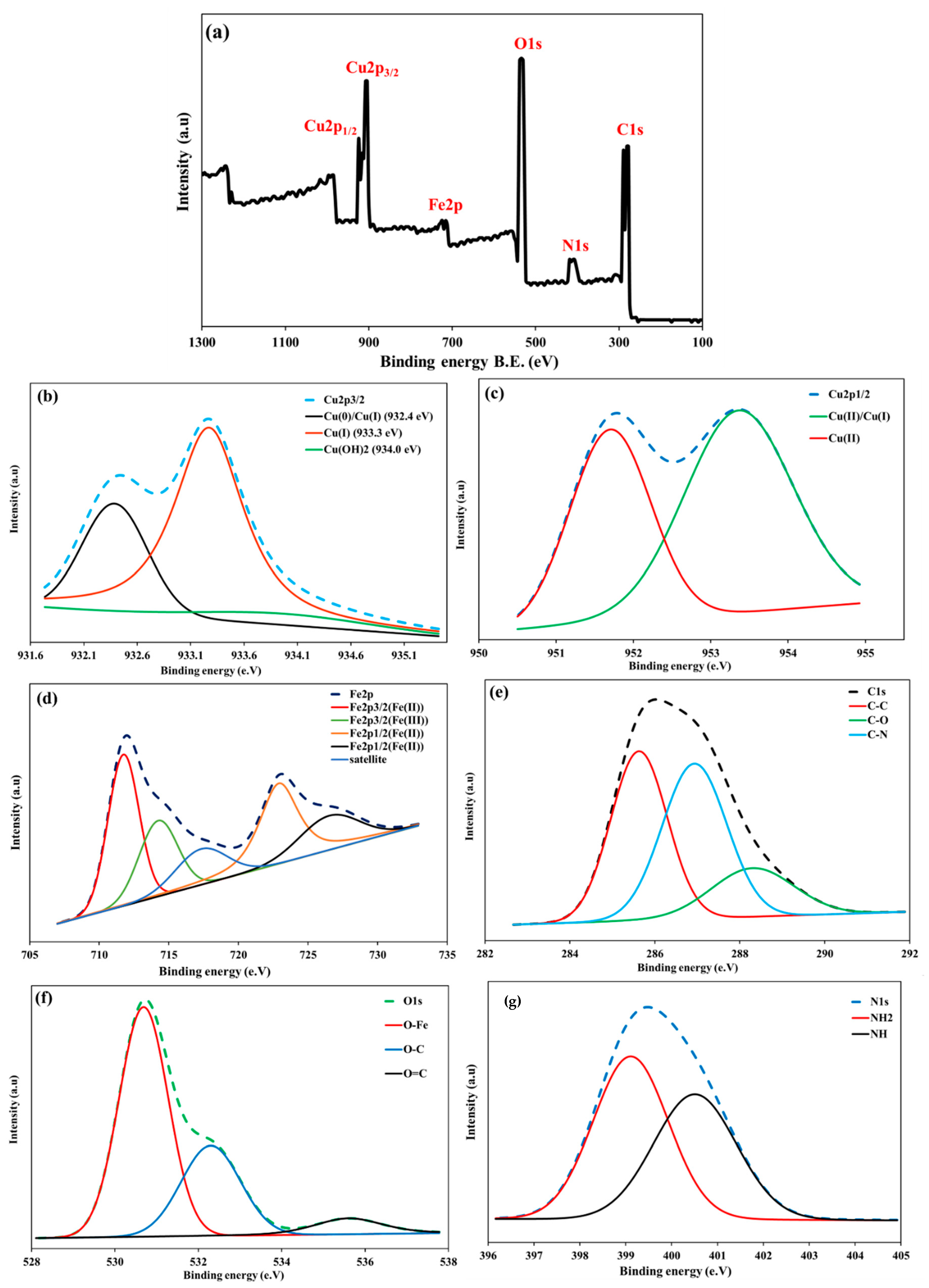 Figure 4. XPS spectrum of full spectrum for Cu@MCS nanocomposite (a), high-resolution scan of Cu2p3/2 (b), Cu2p1/2 (c), Fe2p (d), C1s (e), O1s (f), and N(1s) (g).